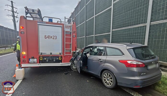 5 listopada po godzinie 7:30 na trasie DK 1 (ul. Beskidzka) w kierunku Katowic doszło do zdarzenia drogowego z udziałem jednego samochodu osobowego. Na śliskiej i mokrej nawierzchni kobieta (ok. 20 lat) kierująca osobowym Citroenem utraciła panowanie nad swoim pojazdem i uderzyła w bariery energochłonne. Na miejsce zdarzenia wezwany został patrol Policji oraz dwa zastępy strażaków JRG Tychy. Podczas dojazdu na miejsce zdarzenia doszło do kolejnej kolizji. W tył średniego samochodu ratowniczo – gaśniczego uderzył osobowy Ford, za którego kierownicą siedział młody mężczyzna (ok. 20 lat). Na miejsce zadysponowany został ZRM oraz dodatkowy zastęp strażaków JRG Tychy. Pomimo znacznych uszkodzeń pojazdów biorących udział w zdarzeniu nikt nie ucierpiał. W trakcie działań prawy pas w kierunku Katowic był wyłączony z ruchu. Utrudnienia w ruchu w miejscu zdarzenia trwały około dwóch godzin. Kierowcy osobówek zostali ukarani wysokimi mandatami karnymi. Około godziny 10 ruch na ul. Beskidzkiej został puszczony oboma pasami.