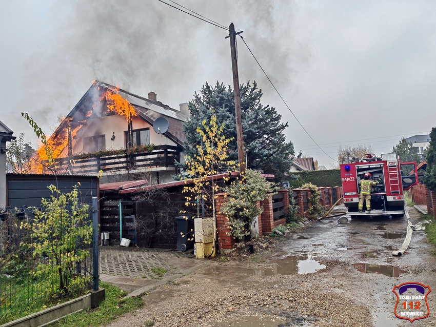 11 listopada około godziny 11:15 dyżurny SK KM PSP Tychy otrzymał zgłoszenie o pożarze domu jednorodzinnego przy ul. Jagodowej. Na miejsce zadysponowany został pluton gaśniczy JRG Tychy oraz patrole Policji. Przybyli na miejsce Policjanci zabezpieczyli miejsce działań oraz ewakuowali z domu lokatorów. Strażacy natomiast przystąpili do działań gaśniczych. Podane zostały prądy wody w natarciu, a dodatkowo strażacy wykorzystali urządzenie przebijająco – chłodzące CouldCut Cobra. Dzięki szybkiej reakcji udało się szybko opanować pożar. Po opanowaniu pożaru strażacy przystąpili do prac rozbiórkowych i przelewania pogorzeliska. Dodatkowo na miejsce pożaru przyjechali pracownicy pogotowia energetycznego celem odłączenia zasilania w budynku. Na szczęście w wyniku pożaru nikt nie ucierpiał. Trwa ustalanie przyczyn i okoliczności powstania pożaru. Działania zostały zakończone po godzinie 15.