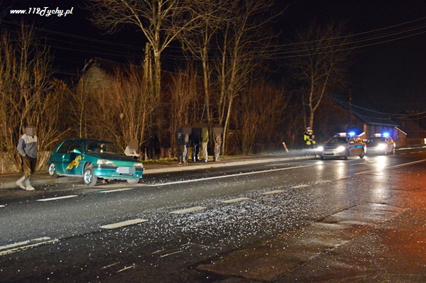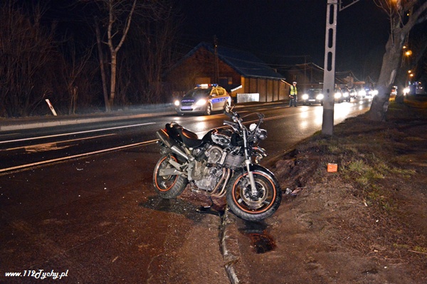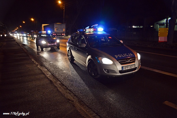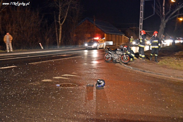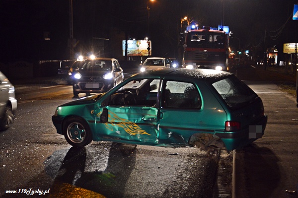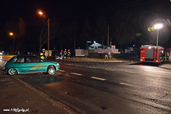 28 lutego około godziny 17:50 do dyżurnego tyskiej Policji wpłynęło zgłoszenie o zdarzeniu drogowym na skrzyżowaniu ulic Mikołowskiej i Dojazdowej. W zdarzeniu miały brać udział samochód osobowy i motocykl. Na miejsce wysłany został patrol WRD KMP Tychy, dwie karetki pogotowia oraz dwa zastępy z JRG Tychy (GBA, SCRt). Po dotarciu na miejsce Policjanci zastali rozbity samochód osobowy Peugeot 106 i motocykl Honda. Poszkodowane zostały dwie osoby: kierująca samochodem kobieta i mężczyzna jadący motocyklem. Prawdopodobnie kobieta wyjeżdżając z ul. Dojazdowej nie ustąpiła pierwszeństwa jadącemu ul. Mikołowską motocykliście.Ze względu na duże zniszczenia i zanieczyszczenie drogi ruch w obu kierunkach został wstrzymany, a na miejsce wezwane zostały dodatkowe patrole Policji. Strażacy natychmiast przystąpili do odłączenia zasilania w rozbitych pojazdach oraz przy użyciu masztów oświetleniowych doświetlali miejsce wypadku. Ranni kierujący zostali zabrani do szpitala, stan kierującego motocyklem został określony na miejscy jako bardzo ciężki. Na miejsce wypadku do pomocy przyjechali również policjanci z WRD KPP w Mikołowie. Po zabraniu rannych do szpitala oraz wykonaniu przez Policjantów dokumentacji ruch został puszczony wahadłowo. Na miejsce wezwani zostali również Policyjni technicy. Ze względu na stan zdrowia rannych oraz uszkodzenia pojazdów zostały one zabezpieczone. Miejsce wypadku zostało posprzątane przez strażaków. Działania zostały zakończone około godziny 19.40. Dokładne przyczyny i okoliczności tego wypadku wyjaśniają tyscy Policjanci.