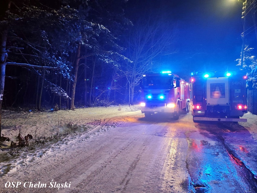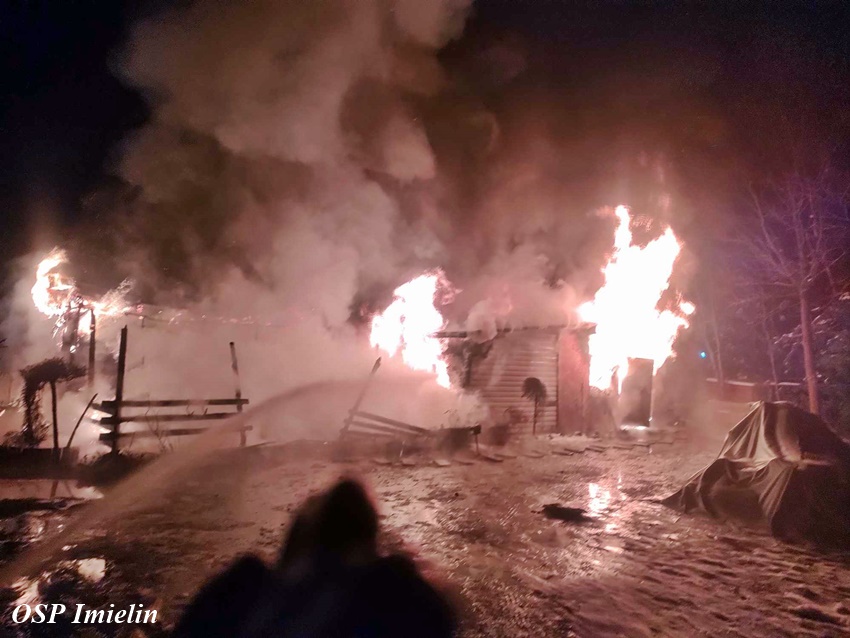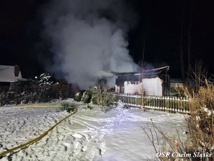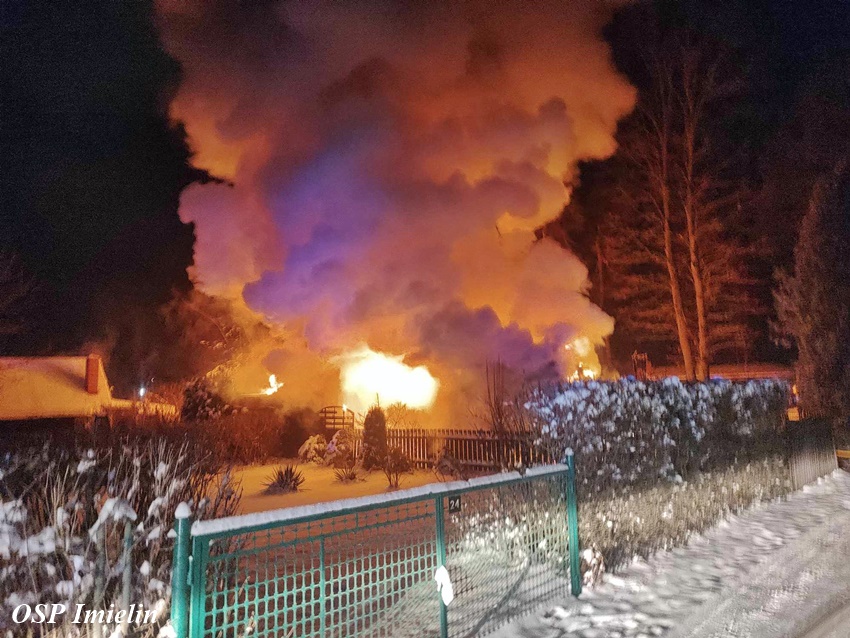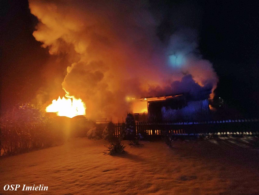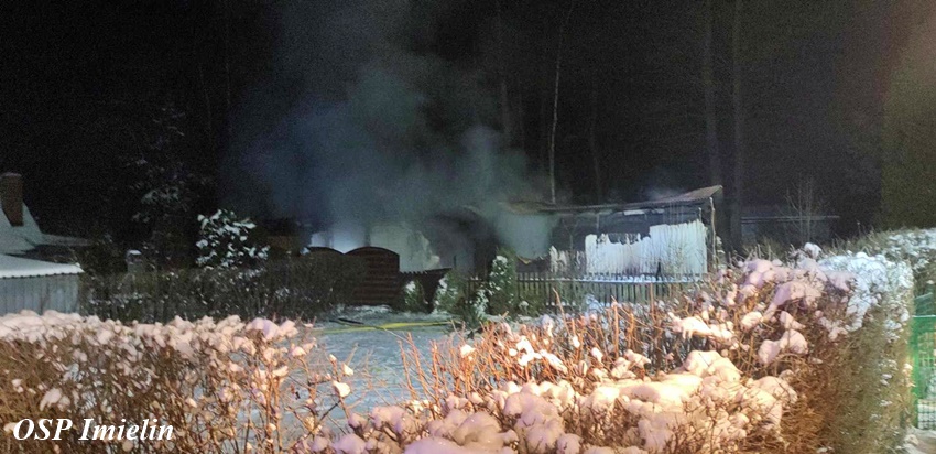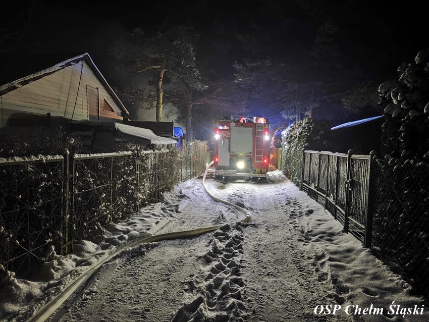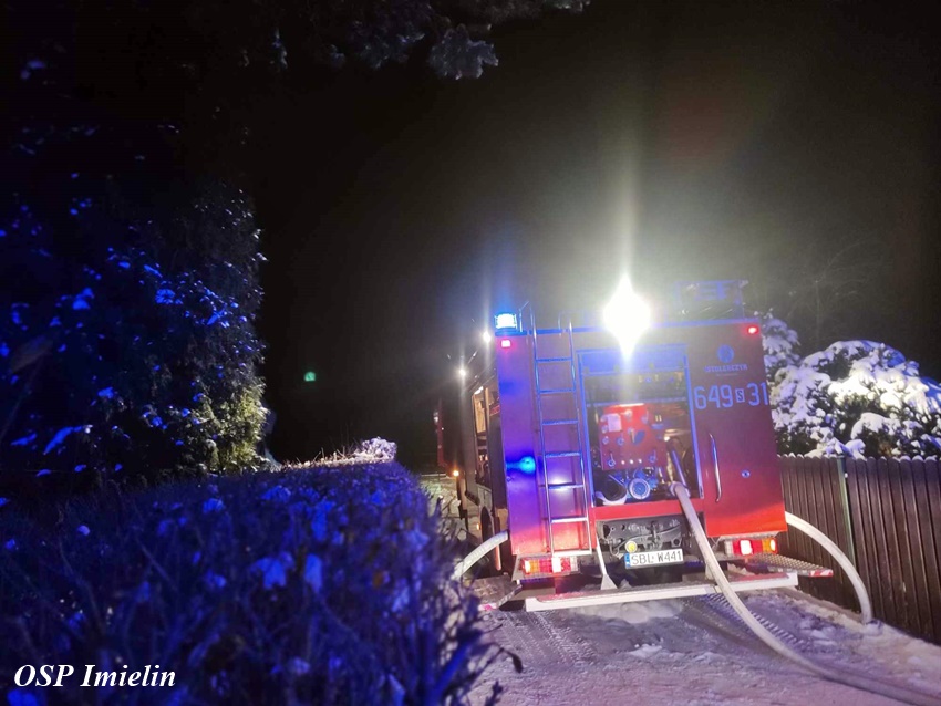 11 stycznia około godziny 1:30 dyżurny SK KM PSP Tychy otrzymał zgłoszenie o pożarze domku letniskowego przy ul. Wandy w Imielinie. Na miejsce zgłoszenia zadysponowane zostały zastępy OSP Imielin, OSP Chełm Śląski oraz JRG Tychy i Policja. Po dotarciu na miejsce strażacy zastali rozwinięty pożar domku, z któego ewakuowali się mieszkańcy. Działania strażaków polegały na zabezpieczeniu miejsca, oświetleniu terenu działań oraz podaniu trzech prądów środka gaśniczego. Bohaterem okazał się być pies właścicieli, który głośnym szczekaniem obudził ich i tym samym uratował. Strażacy z płonącego budynku wynieśli dwie butle z gazem propan – butan. Po opanowaniu i ugaszeniu pożaru strażacy sprawdzili pogorzelisko i wykonali niezbędne prace rozbiórkowe. Przyczyny i okoliczności pożaru wyjaśni policyjne dochodzenie. Działania na miejscu zostały zakończone około godziny 7 rano.