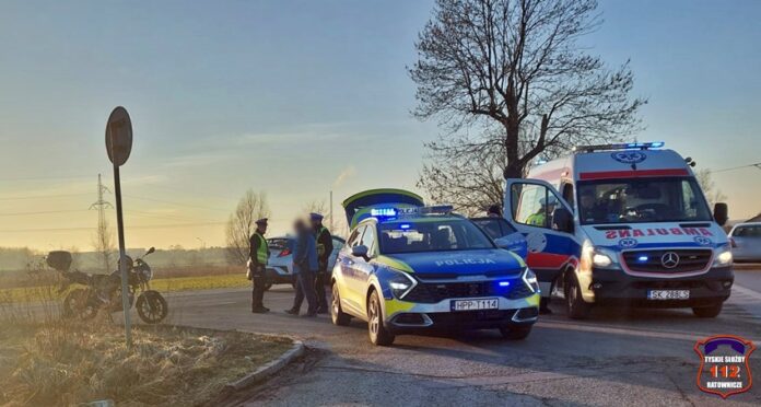 29 stycznia około godziny 15:15 na ul. Oświęcimskiej w rejonie wyjazdu z bramy towarowej fabryki samochodów doszło do groźnie wyglądającego zdarzenia drogowego z udziałem samochodu osobowego marki VW oraz motocykla marki Keeway. Kierująca VW wymusiła pierwszeństwo na kierowcy jednośladem, w wyniku którego obrażeń ciała (noga) doznała pasażerka jednośladu. Na miejsce wezwany został ZRM oraz Policja. Pasażerka jednośladu trafiła pod opiekę ratowników medycznych, a następnie została przewieziona do szpitala na dokładna diagnostykę. Kierujący pojazdami byli trzeźwi. Jak się okazało sprawczyni zdarzenia nie posiadała uprawnień do kierowania pojazdami. Dodatkowo z relacji świadków zdarzenia wynika, że po zdarzeniu próbowała się ona oddalić z miejsca zdarzenia nie udzielając pomocy. Została zatrzymana przez świadków i przekazana przybyłem na miejsce funkcjonariuszom Policji. W związku z powyższym jej samochód został zabezpieczony i odholowany na policyjny parking. Dalsze postępowanie w sprawie tego wypadku prowadzą funkcjonariusze KMP Tychy.
