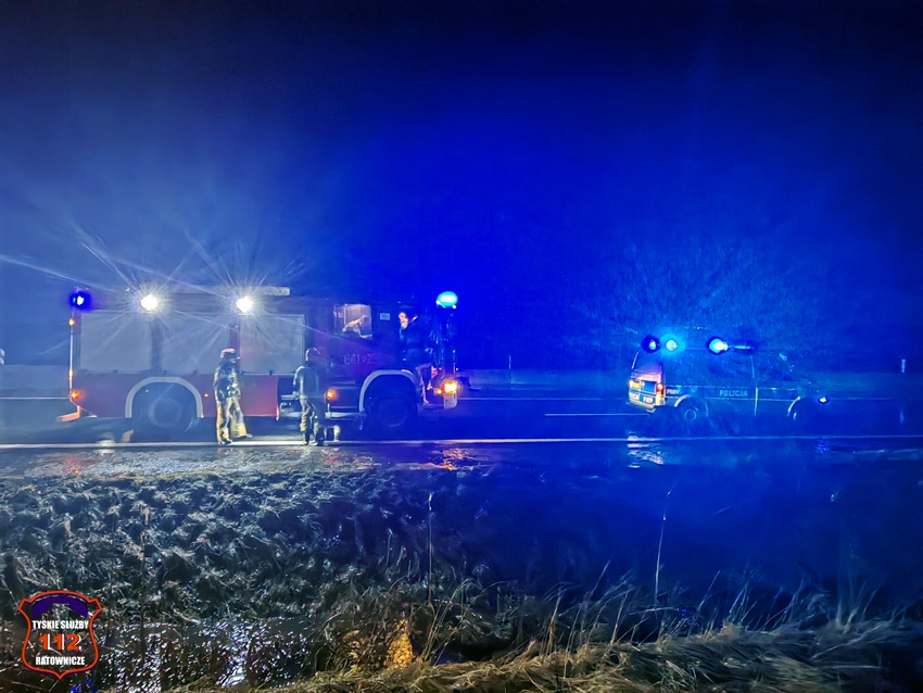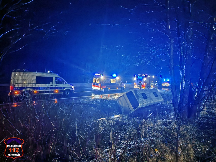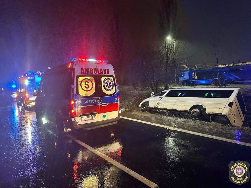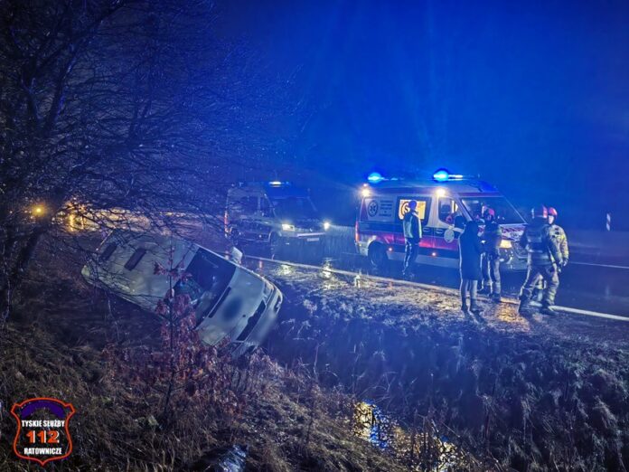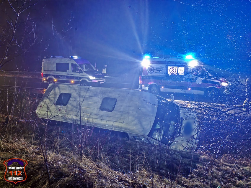 8 lutego około godziny 22:20 dyżurni KMP Tychy i SK KM PSP Tychy otrzymali zgłoszenie o wypadku drogowym na ul. Turyńskiej w rejonie fabryki samochodów Stellantis. Ze zgłoszenia wynikało, że bus przewożący ludzi zjechał do przydrożnego rowu. Na miejsce zdarzenia natychmiast zadysponowane zostały: ZRM, zastępy strażaków OSP Bieruń Stary, ZSR Sirio oraz JRG Tychy oraz Policja. W trakcie działań ratunkowych ruch w kierunku Bierunia był całkowicie zablokowany. Pojazdem podróżowało siedem osób. Sześć osób nie doznało obrażeń, a kierowca busa marki Mercedes trafił pod opiekę ratowników medycznych. Podjęta została decyzja o konieczności jego transportu do szpitala na dokładne badania. Jak się okazało do zdarzenia doszło już na terenie podległym KPP Bieruń. W związku z powyższym do obsługi zdarzenia został zadysponowany patrol bieruńskiej drogówki. Że wstępnych ustaleń pracujących na miejscu Policjantów wynika, że do zdarzenia doszło w wyniku nagłego zachorowania kierującego (podejrzenie zawału serca). Około godziny 23 w kierunku Bierunia został udrożniony lewy pas. Policjanci KPP Bieruń do późnych godzin nocnych będą prowadzić swoje działania na miejscu zdarzenia.
