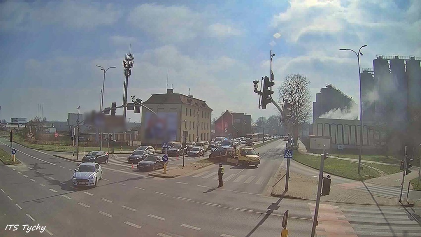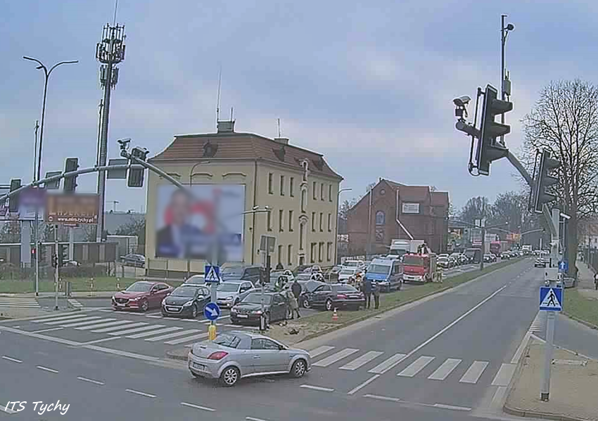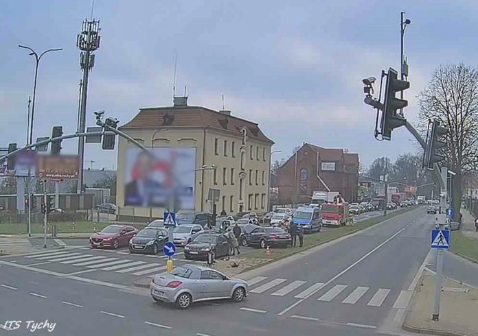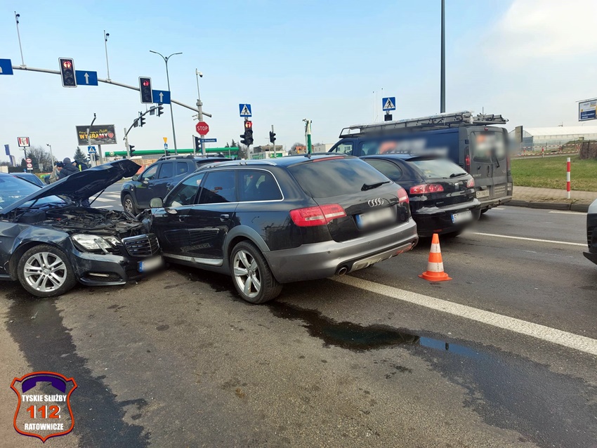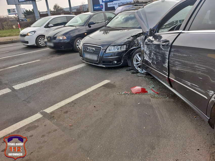 Z ustaleń pracujących na miejscu Policjantów jak i relacji uczestników zdarzenia wynika, że kierująca BMW kobieta jadąc w kierunku centrum miasta na skrzyżowaniu próbowała zmienić pas z prawego na lewy i uderzyła w bok jadącego obok Mercedesa. Kierujący Mercedesem po uderzeniu stracił panowanie nad swoim pojazdem, uderzył w krawężnik, słup sygnalizacji świetlnej oraz dwa pojazdy (Audi i Saab) oczekujące przed skrzyżowaniem. Dodatkowo na miejsce wezwani zostali pracownicy pogotowia sygnalizacyjnego do uszkodzonego słupa. Utrudnienia w ruchu w miejscu zdarzenia trwały blisko dwie godziny. Policjanci KMP Tychy prowadzą dalsze czynności w tej sprawie.