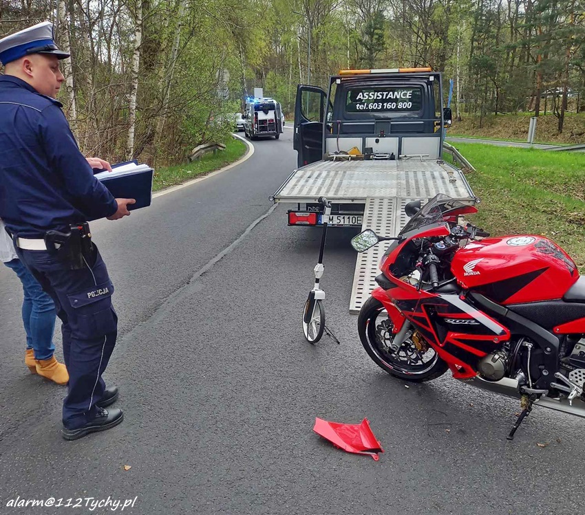 6 kwietnia około godziny 12:20 dyżurny SK KM PSP Tychy otrzymał zgłoszenie o wypadku z udziałem motocyklisty w rejonie zjazdu z trasy DK 86 na ul. Katowicką. Ze zgłoszenia wynikało, że u mężczyzny doszło do zatrzymania krążenia. Na miejsce zdarzenia zadysponowane zostały: zastępy strażaków JRG Tychy, ZRM oraz Policja. Przed przybyciem służb z pomocą poszkodowanemu motocykliście pospieszyli świadkowie zdarzenia. Niestety pomimo wdrożenia medycznych czynności ratunkowych nie udało się przywrócić funkcji życiowych 43 – letniemu mężczyźnie (mieszkaniec Tychów). Na miejsce wezwany został policyjny technik kryminalistyki oraz prokurator. Na czas działań droga została zablokowana. Ze wstępnych ustaleń pracujących na miejscu Policjantów jak i relacji świadków zdarzenia wynika, że kierujący motocyklem marki Honda mężczyzna wyprzedzał ciąg pojazdów i „złapał” pobocze, po czym utracił panowanie nad jednośladem i wpadł do przydrożnego rowu i zagajnika. Policjanci KMP Tychy prowadzą postępowanie w tej sprawie.