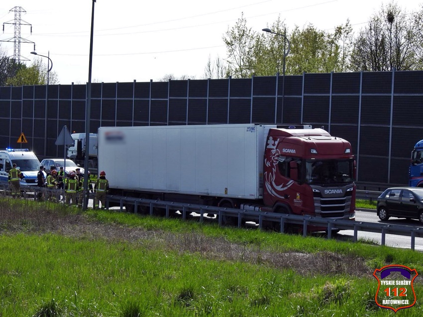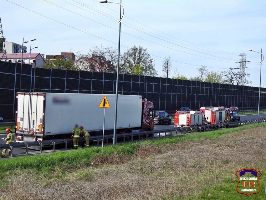 8 kwietnia po godzinie 15 na trasie DK 1 w rejonie skrzyżowania z ul. Fabryczną i ul. Przemysłową doszło do zdarzenia drogowego. Kierujący ciągnikiem siodłowym marki Scania z naczepą uderzył w bariery energochłonne. Na miejsce zdarzenia wezwane zostały: patrole Policji oraz zastępy strażaków JRG Tychy. W wyniku zdarzenia na szczęście nikt nie ucierpiał. Po około czterdziestu minutach działania zostały zakończone.