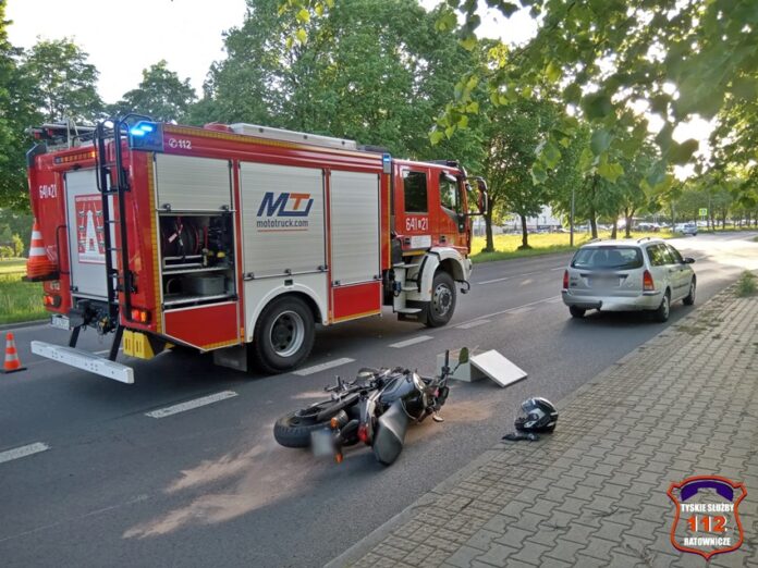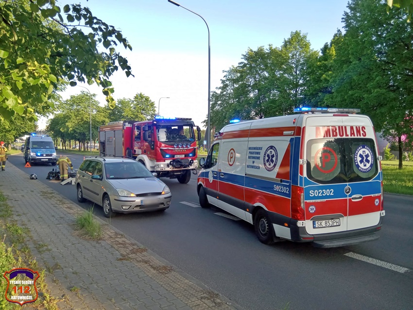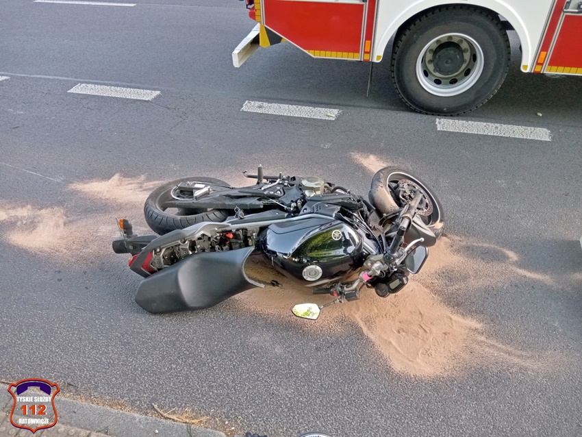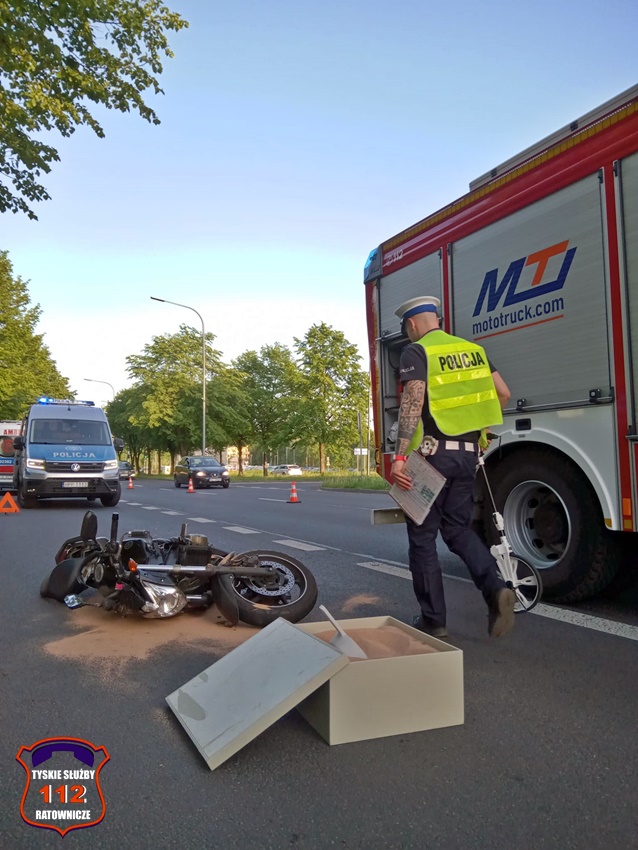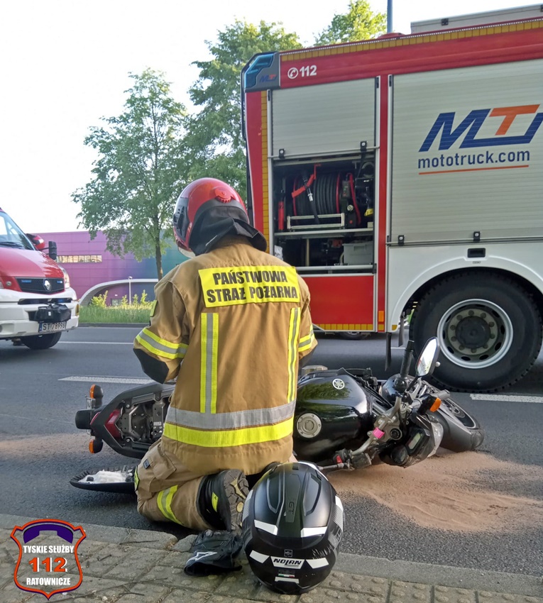 30 kwietnia po godzinie 18 na ul. Sikorskiego w rejonie skrzyżowania z ul. Dmowskiego doszło do zdarzenia drogowego, w którym poszkodowany został motocyklista. Na miejsce zdarzenia wezwane zostały: zastępy strażaków JRG Tychy, ZRM oraz Policja. W trakcie działań ruch w kierunku al. Bielskiej odbywał się tylko jednym pasem. Jak wstępnie ustalili pracujący na miejscu Policjanci do zdarzenia doszło w momencie gdy kierowca osobowego Forda zawracał na ul. Sikorskiego i wjechał wprost pod jadącego w kierunku al. Bielskiej motocyklistę. Motocyklista chcąc uniknąć zderzenia „położył” maszynę ale i tak doszło do kontaktu. Motocyklista z obrażeniami ciała trafił pod opiekę ratowników medycznych, a następnie został przewieziony do szpitala na dokładną diagnostykę. Dodatkowo na miejsce wezwany został technik kryminalistyki. Działania strażaków na miejscu zdarzenia polegały na jego zabezpieczeniu, odłączeniu akumulatorów w pojazdach oraz sorpcji plamy płynów eksploatacyjnych. Działania służb jak i utrudnienia w ruchu na miejscu zdarzenia trwały blisko dwie godziny. Policjanci KMP Tychy prowadzą dalsze postępowanie w tej sprawie.