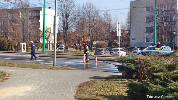 28 lutego około godziny 11.50 do MSK w Tychach wpłynęło zgłoszenie o plamie oleju na ul. Armii Krajowej. Na miejsce zadysponowany został jeden zastęp z JRG Tychy (GBA). Po dotarciu na iejsce strażacy zastali plamę o długości około 300m. Ze względu na jej rozmiar i umiejscowienie poprosili o wsparcie Policję. Na miejsce przyjechał patrol WRD, którego załoga zajęła się kierowaniem ruchem w trakcie działań. Strażacy przy użyciu Sintanu, a następnie wody usunęli plamę. Działania i utrudnienia trwały około godziny.