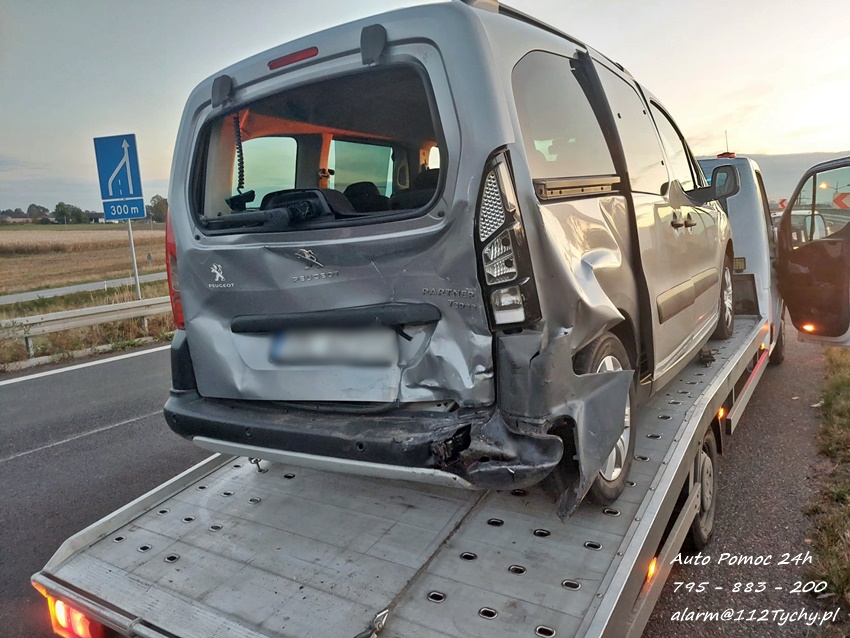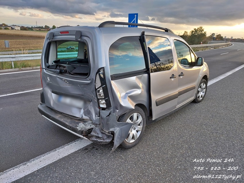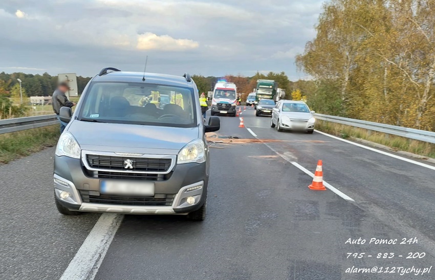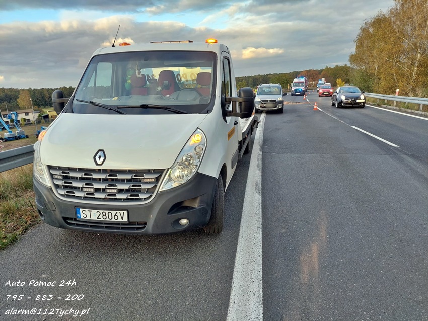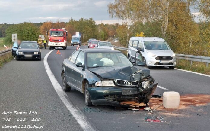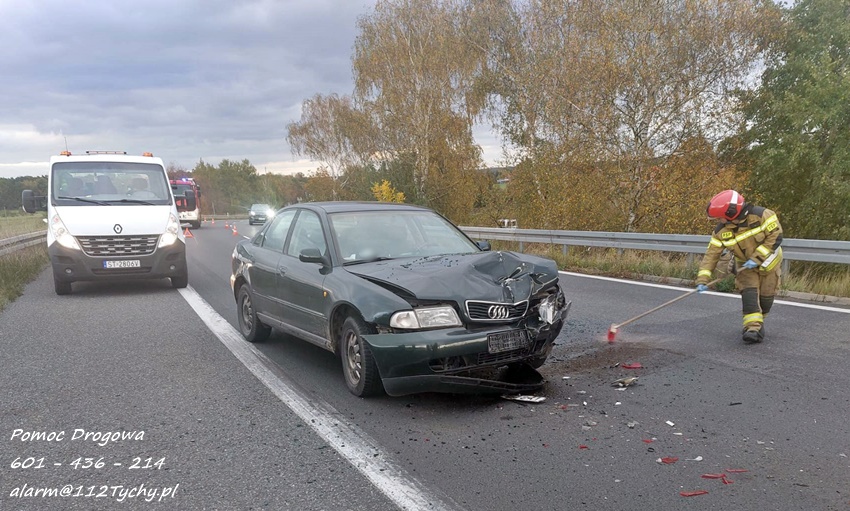 11 października około godziny 16:30 na trasie S1 ok. 300m przed zjazdem na trasę DK 1 w kierunku Pszczyny doszło do zdarzenia drogowego z udziałem dwóch samochodów osobowych. W tył Peugeota z dużą siła uderzyło Audi. Na miejsce zdarzenia wezwany został patrol Policji oraz zastęp strażaków JRG Tychy. Na czas działań prawy pas został zablokowany. Osoby podróżujące pojazdami nie doznały obrażeń. Kierujący pojazdami zostali poddani badaniu trzeźwości. Kierowca Peugeota wydmuchał na alkomacie 0,00 mg/l, natomiast kobieta kierująca Audi wydmuchała 1,22mg/l co dało 2,56 promila. Pracujący na miejscu Policjanci zatrzymali kobietę oraz jej prawo jazdy. Na miejsce przyjechała córka sprawczyni zdarzenia, która po chwili źle się poczuła. Na miejsce wezwany został ZRM, a ratownicy zajęli się kobietą. Uszkodzone pojazdy zostały odholowane przez pomoc drogową. Sprawa będzie miała swój finał w sądzie. Działania na miejscu trwały blisko dwie godziny.