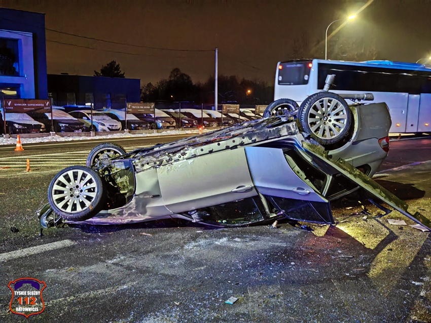 23 listopada około godziny 21:45 na ul. Oświęcimskiej doszło do zdarzenia drogowego. Na prostym odcinku drogi 28 – latek kierujący samochodem marki BMW utracił panowanie nad pojazdem wjechał na chodnik gdzie ściął znaki drogowe i latarnię, a następnie dachował blokując drogę w kierunku trasy DK1. Z pomocą mężczyźnie pospieszyli świadkowie zdarzenia Świadkowie również powiadomili o zdarzeniu służby ratunkowe. Na miejsce zadysponowane zostały: ZRM, zastęp strażaków JRG Tychy oraz Policja. W trakcie działań ruch w miejscu zdarzenia był zablokowany, a następnie odbywał się wahadłowo. Pracujący na miejscu Policjanci poddali mężczyznę badaniu alkomatem. Wynik to o zgrozo: 1,74 mg/l co dało 3,65 promila alkoholu w wydychanym powietrzu. Mężczyzna w eskorcie Policji został przewieziony do szpitala na dokładne badania. Po badaniach mężczyzna został zatrzymany i odpowie przed sądem za swoje nieodpowiedzialne zachowanie. Jak się okazało przed dachowaniem mężczyzna na skrzyżowaniu z ul. Długą spowodował dodatkowo kolizję z samochodem osobowym marki VW i uciekł z miejsca. Działania na miejscu trwały do późnych godzin nocnych. Policjanci KMP Tychy prowadzą dalsze postępowanie w tej sprawie.