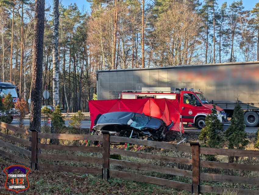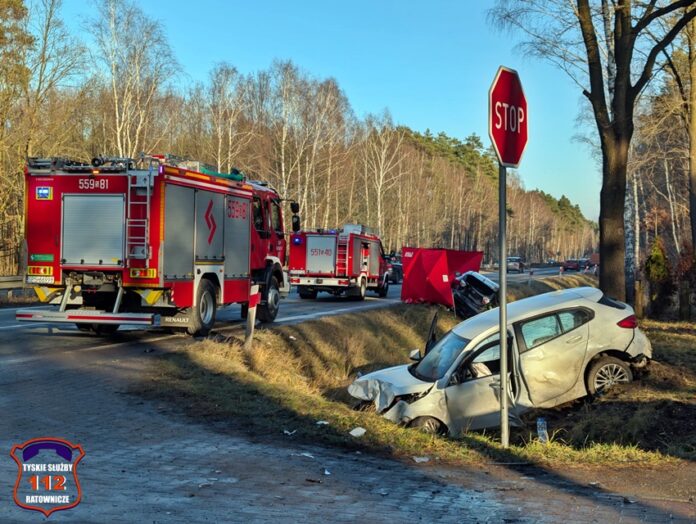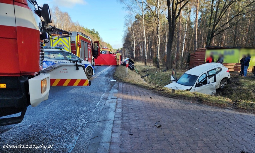 21 grudnia około godziny 10:50 na trasie DK1 (572km) w Kobiórze przy zjeździe do Grill Bar doszło do tragicznego w skutkach zdarzenia drogowego z udziałem trzech pojazdów. W zdarzeniu brały udział: Fiat Ducato, Kia Rio oraz BMW. Z pomocą poszkodowanym pospieszyli świadkowie zdarzenia, a wśród nich druh Krzysztof Jaworski z jednostki OSP Bieruń Stary. Świadkowie dodatkowo zabezpieczyli miejsce zdarzenia i wezwali służby ratunkowe. Do działań zadysponowane zostali ratownicy medyczni WPR Katowice, strażacy JRG Tychy, OSP Kobiór, JRG Pszczyna oraz patrole Policji i załoga Lotniczego Pogotowia Ratunkowego – Ratownik 4. Na czas działań ruch w obu kierunkach został całkowicie zablokowany, a Policja wyznaczyła objazdy. Niestety w wyniku tego wypadku dwie osoby podróżujące Kią nie żyją. Pasażerka (49 lat) pojazdu zginęła na miejscu, a kierowca (51 lat) zmarł w szpitalu. Osoby podróżujące Fiatem oraz BMW nie doznały obrażeń skutkujących koniecznością hospitalizacji. Z ustaleń pracujących na miejscu Policjantów wynika, że sprawcą zdarzenia jest kierowca Fiata, który uderzył w tył samochodu Kia, którego kierowca oczekiwał na możliwość wykonania skrętu w lewo z trasy DK1 na parking Grill Baru. Kia po uderzeniu w tył przemieściła się na przeciwległy pas gdzie doszło do czołowego zderzenia z jadącym w kierunku Tychów BMW. Policjanci KPP Pszczyna pod nadzorem prokuratury prowadzą dalsze czynności w tej sprawie.