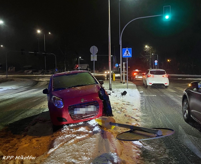 12 stycznia około godziny 18:30 na skrzyżowaniu ul. Cieszyńskiej (DK81) z ul. Rybnicką w Mikołowie doszło do zdarzenia drogowego. Kierujący samochodem osobowym marki Suzuki wykonując manewr skrętu z ul. Cieszyńskiej w ul. Rybnicką utracił panowanie nad swoim pojazdem i uderzył w słup. Na miejsce zadysponowany został patrol Policji. Jak się okazało po przybyciu funkcjonariuszy na miejsce, kierowca nei powinien był wsiadać za kółko. Badanie alkomatem pokazało 0,59mg/l co dało ponad 1,2 promila. Mężczyzna został zatrzymany i przewieziony do KPP Mikołów celem wykonania dalszych czynności, a pojazd trafił na policyjny parking.