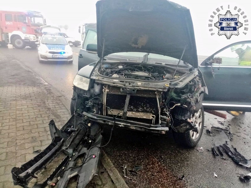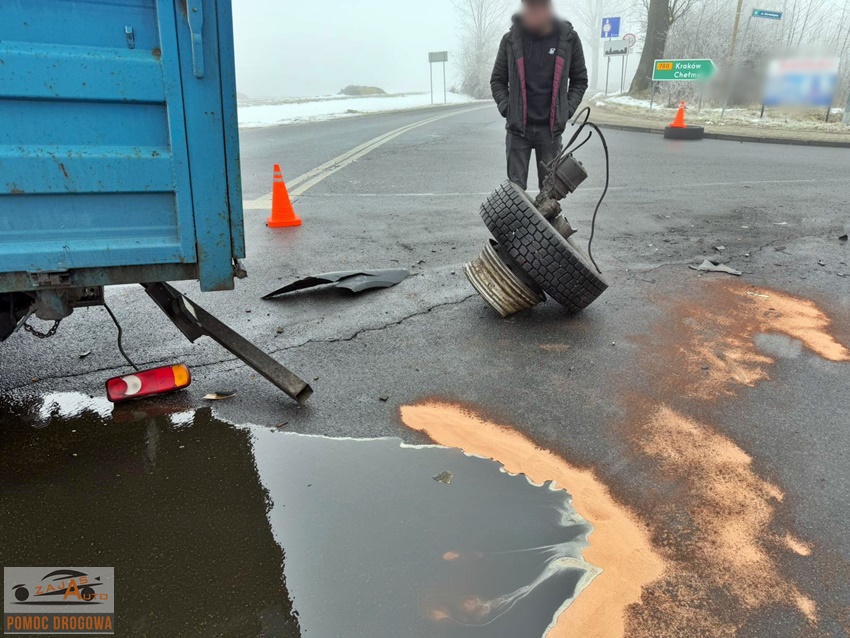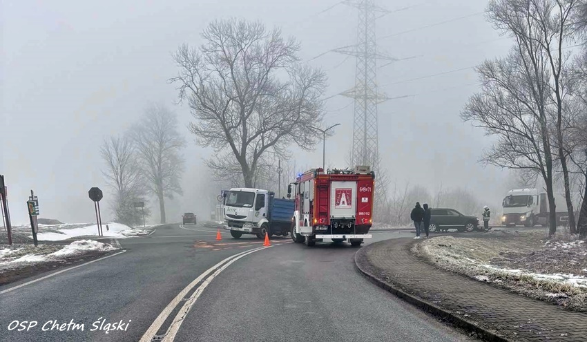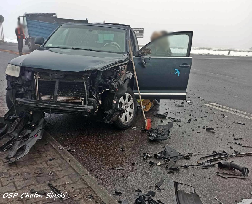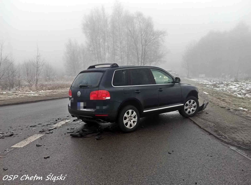 20 stycznia około godziny 8 na skrzyżowaniu ul. Górnośląska – Olimpijska w Chełmie Śląskim doszło do zdarzenia drogowego z udziałem samochodu osobowego marki VW oraz ciężarowego Renault. Na miejsce wezwany został patrol Policji oraz zastęp strażaków OSP Chełm Śląski. W trakcie działań ruch na skrzyżowaniu był wstrzymany. Patrząc na zniszczenia pojazdów, aż dziw że nikt nie ucierpiał. Ze wstępnych ustaleń pracujących na miejscu Policjantów wynika, że na łuku drogi kierująca VW Tuareg utraciła panowanie nad pojazdem i uderzyła w tylna oś ciężarowego Renault urywając mu koła. Na jezdnię wylało się znaczna ilość oleju, który został zneutralizowany przez strażaków. Uszkodzone pojazdy zostały odholowane przez pomoce drogowe.