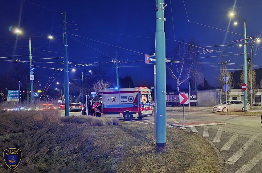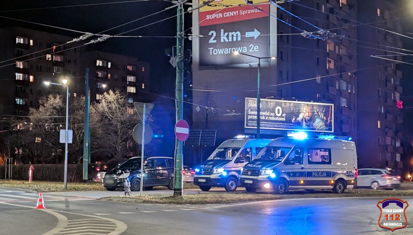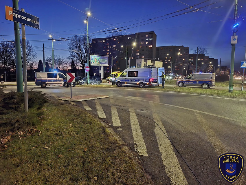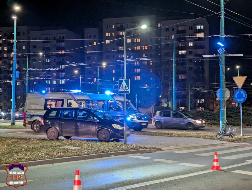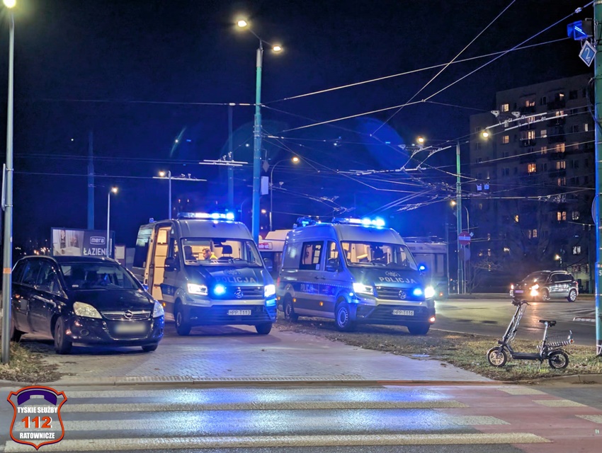30 stycznia około godziny 16:40 na oznakowanym przejściu dla pieszych z wyznaczoną ścieżką rowerową w ciągu al. Piłsudskiego przy rondzie Paprocańskim (Armii Krajowej – Piłsudskiego) doszło do potrącenia starszego mężczyzny poruszającego się na hulajnodze elektrycznej przez kierującą samochodem osobowym marki Opel. Z pomocą mężczyźnie pospieszyli patrolujący miasto strażnicy miejscy oraz świadkowie zdarzenia. Na miejsce wezwany został ZRM oraz patrole Policji. W trakcie działań pas wjazdowy na rondo był zablokowany. Poszkodowany 76 – latek z obrażeniami ciała został przewieziony do szpitala. Kierująca Oplem 48 – letnia kobieta jak i poszkodowany mężczyzna byli trzeźwi. Ze względu na obrażenia mężczyzny, zdarzenie został zakwalifikowane jako wypadek. Celem zabezpieczenia śladów i wykonania dokumentacji na miejsce wezwany został policyjny technik kryminalistyki. Działania na miejscu wypadku trwały kilka godzin. Policjanci KMP Tychy prowadzą czynności mające na celu wyjaśnienie przyczyn i okoliczności tego wypadku.