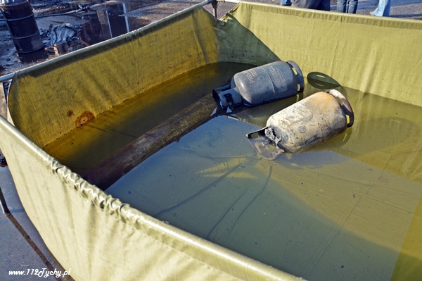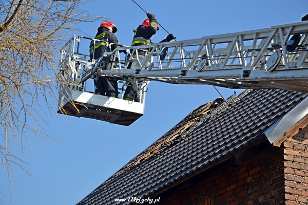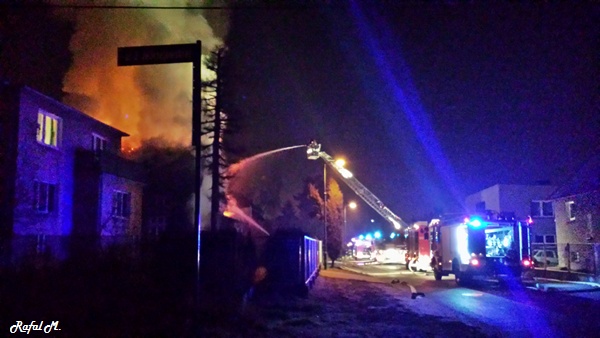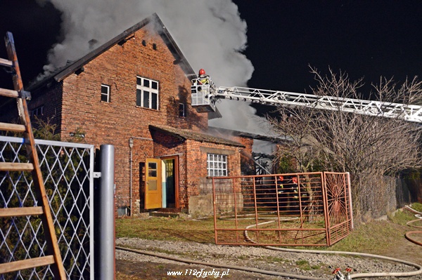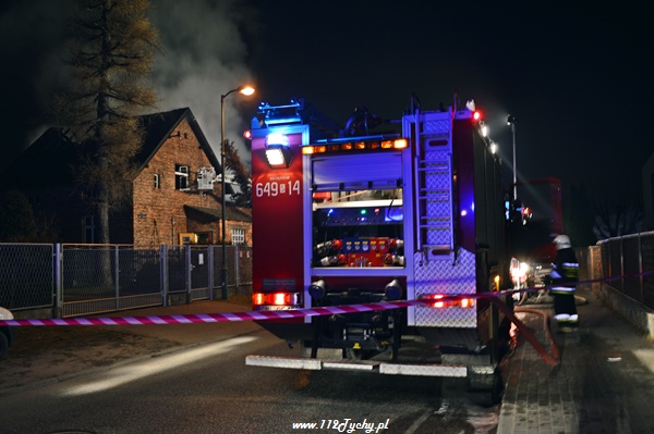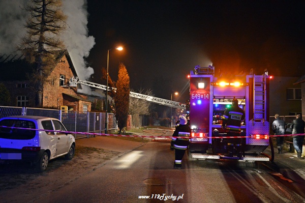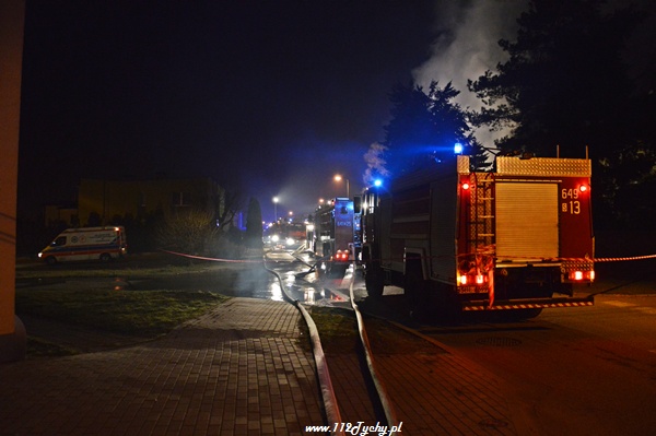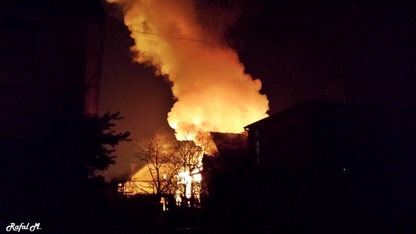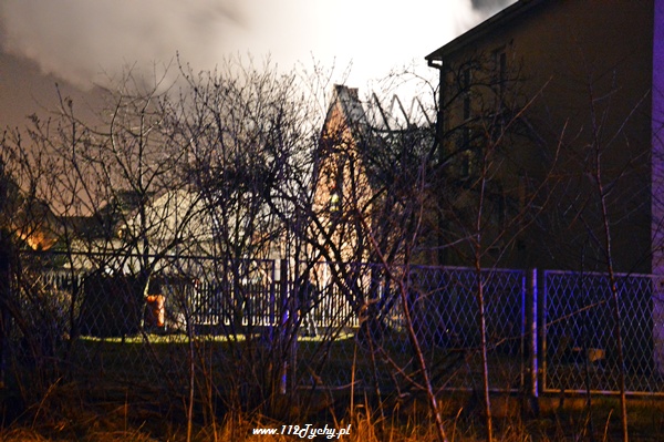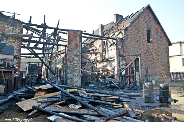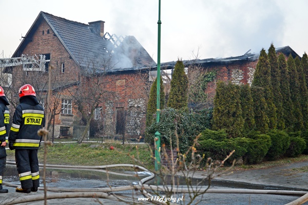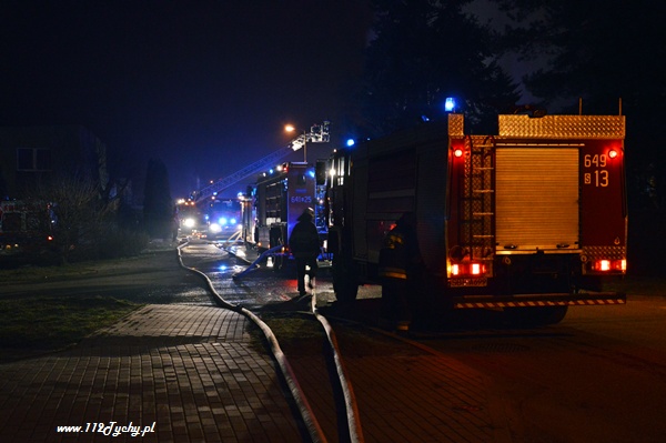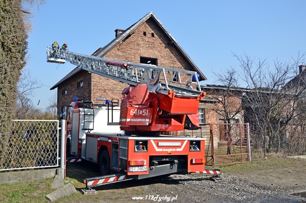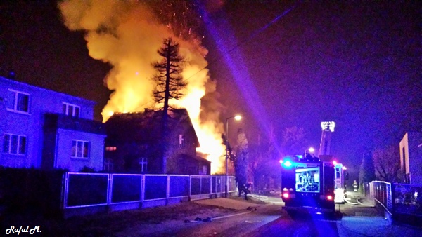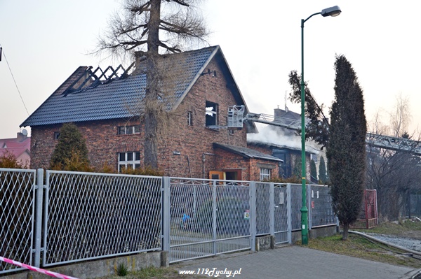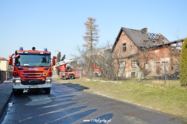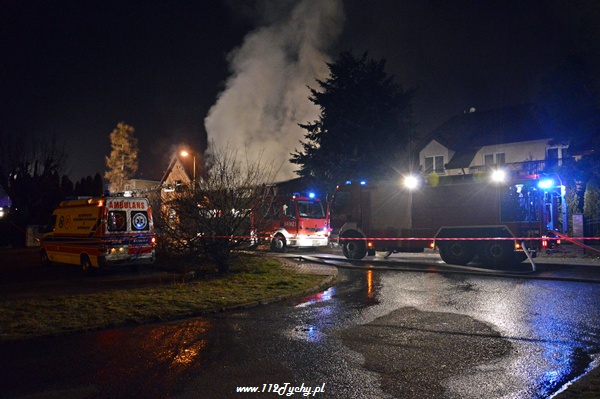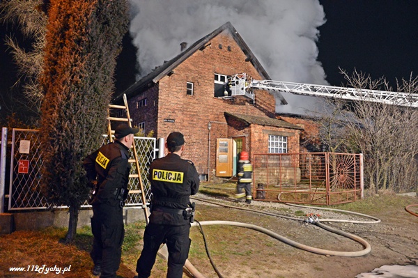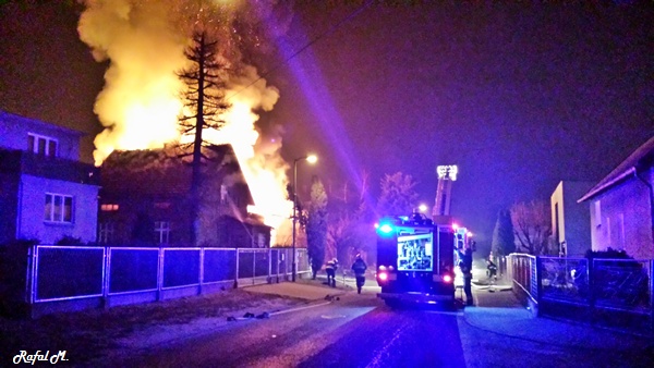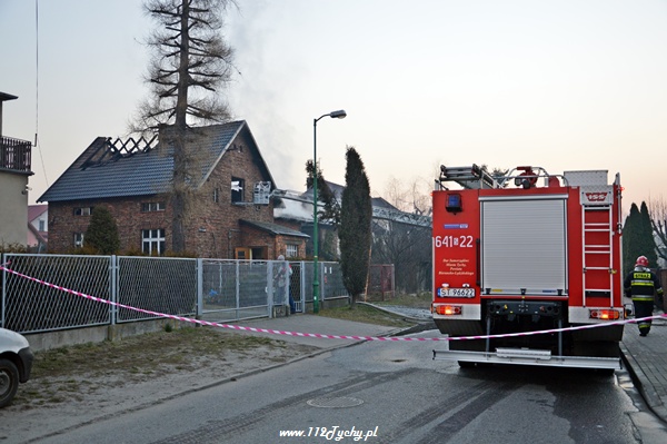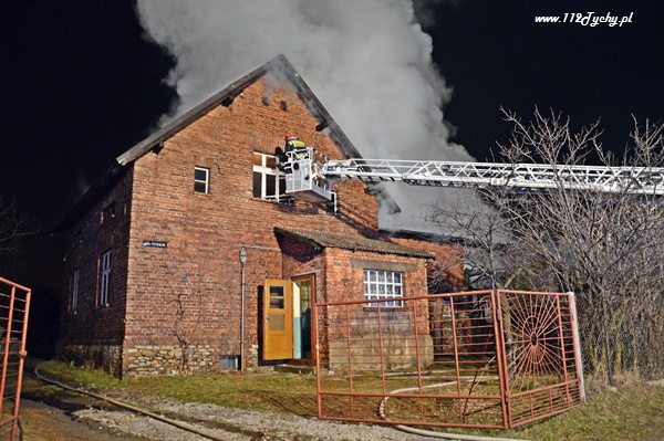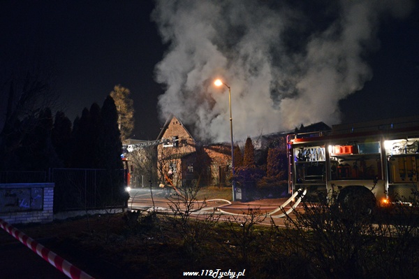 13 marca przed godziną 4 rano do dyżurnego tyskiej Straży Pożarnej wpłynęło zgłoszenie o pożarze jednego z domów jednorodzinnych na ul. Prostej. Na miejsce natychmiast zadysponowane zostało 5 zastępów z JRG Tychy (GBA, GBA, GCBA, GCBA, SD), patrol Policji oraz ZRM. Po dotarciu na miejsce strażacy zastali płonące poddasze, dach i przyległy budynek gospodarczy. Kierujący działaniami ratowniczymi podjął decyzję o zadysponowaniu na miejsce dodatkowo kolejnych zastępów. Do pomocy zadysponowane zostały zastępy z podległych jednostek OSP z powiatu bieruńsko – lędzińskiego. Na miejsce przyjechały dwa zastępy z OSP Bieruń Stary (GCBA, GCBA), jeden zastęp z OSP Lędziny (GBA). Na czas trwania działań ratowniczo – gaśniczych na zabezpieczenie miasta zadysponowany został jeden zastęp z OSP Bieruń Nowy (GBARt). Na miejscu działań podanych zostało 5 prądów wody plus jeden z szybkiego natarcia. Przy użyciu drabiny mechanicznej strażacy gasili dach. W trakcie przeszukania płonącego domu strażacy znaleźli butle z gazem oraz butlę z acetylenem. Została podjęta decyzja o konieczności wyznaczenia większej strefy bezpieczeństwa oraz schłodzeniu butli. W tym celu na miejsce zadysponowany został kolejny zastęp z JRG Tychy (SLKw), którym został dowieziony zbiornik brezentowy na wodę. Na miejsce działań przyjechał również Dowódca JRG Tychy i oficer operacyjny. Na miejsce pożaru wezwany został również inspektor nadzoru budowlanego. Około godziny 5.40 zastępy jednostek OSP zostały przedysponowane do pożaru autobusu linii 262 w Lędzinach. Nikt nie został poszkodowany. Działania na miejcu zostały zakończone okolo godziny 10.30. Inspektor nadzoru budowlanego wydał zakaz użytkowania budynku. Celem ustalenia przyczyn pożaru został powołany biegły. Dalsze czynności wyjaśniające prowadzą tyscy Policjanci.