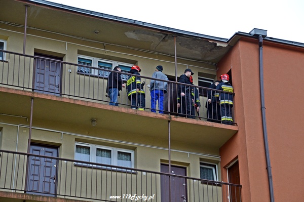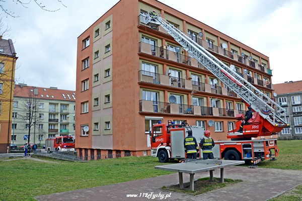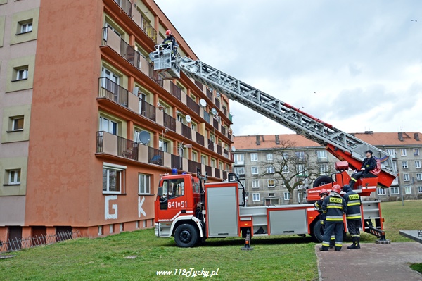 15 marca około godziny 13.15 do dyżurnego tyskiej Straży Pożarnej wpłynęło zgłoszenie o zalewaniu jednego z mieszkań na ul. Ejsmonda. Na miejsce wysłany został jeden zastęp z JRG Tychy (GBA). Po dotarciu na miejsce po podjęciu kilku prób wejścia do mieszkania okazały się niemożliwe. Na miejsce wezwana została drabina mechaniczna z JRG Tychy. Po sprawdzeniu przez okna została podjęta decyzja o konieczności wejścia do mieszkania przez zamknięte drzwi. Na miejsce wezwany został patrol prewencji Policji. Przybyli na miejsce Policjanci wraz ze Strażakami i przedstawicielami Pogotowia Awaryjnego MZBM-u weszli do mieszkania. W mieszkaniu został znaleziony pies. W całym mieszkaniu panował ogólny bałagan. Na miejsce wezwany został patrol tyskiej Straży Miejskiej. Strażnicy zaopiekowali się psem znalezionym w mieszkaniu – został on przewieziony do schroniska . Pracownicy pogotowia awaryjnego zakręcili wodę w mieszaniu. Około godziny 15 mieszkanie zostało zabezpieczone i działania zostały zakończone.