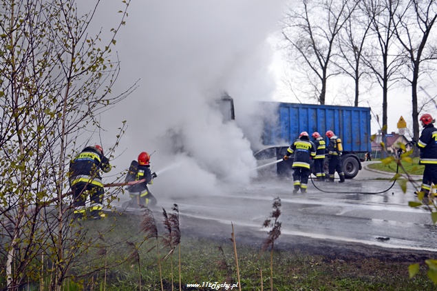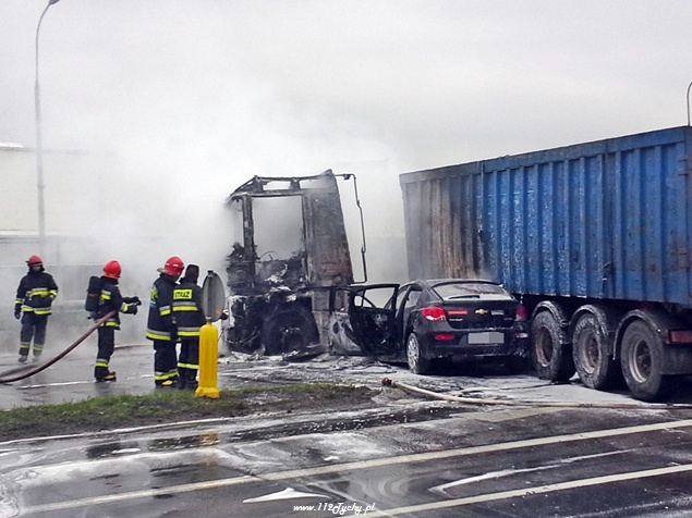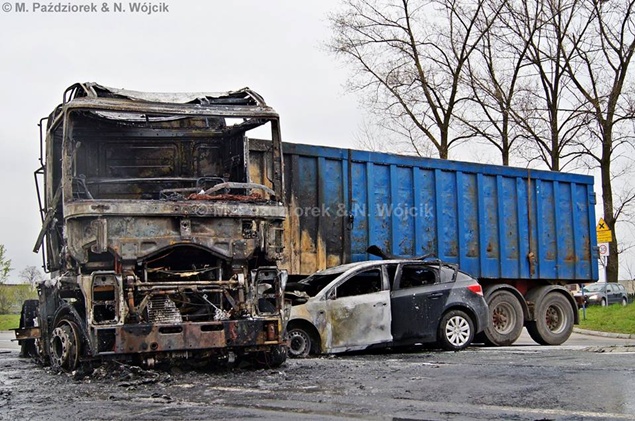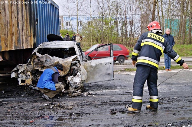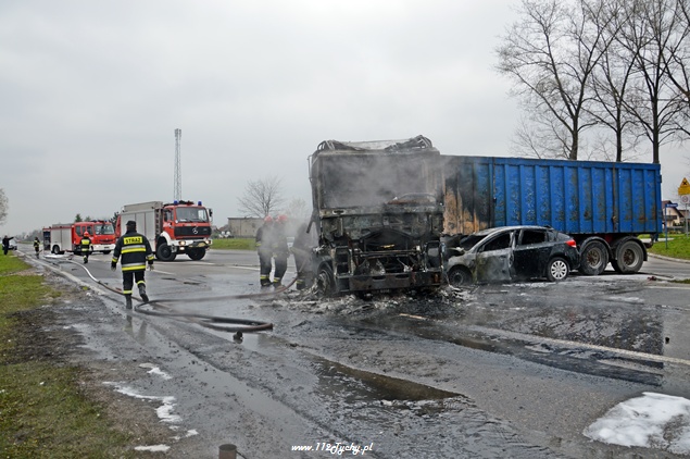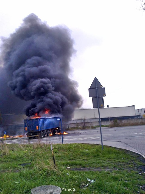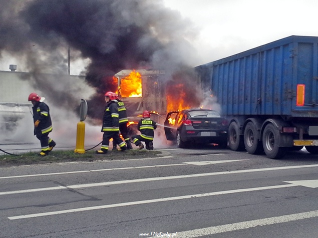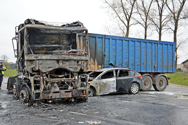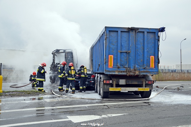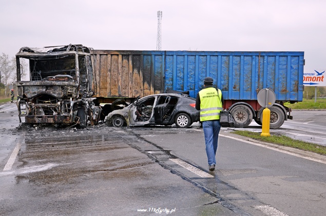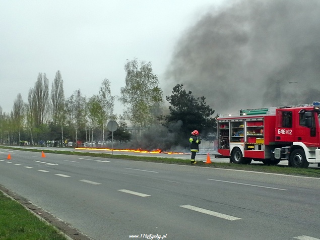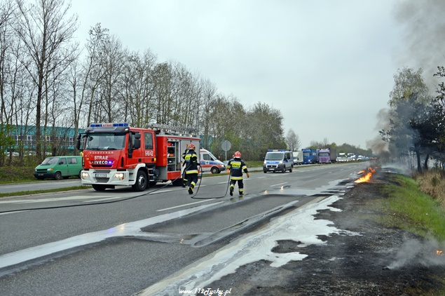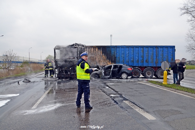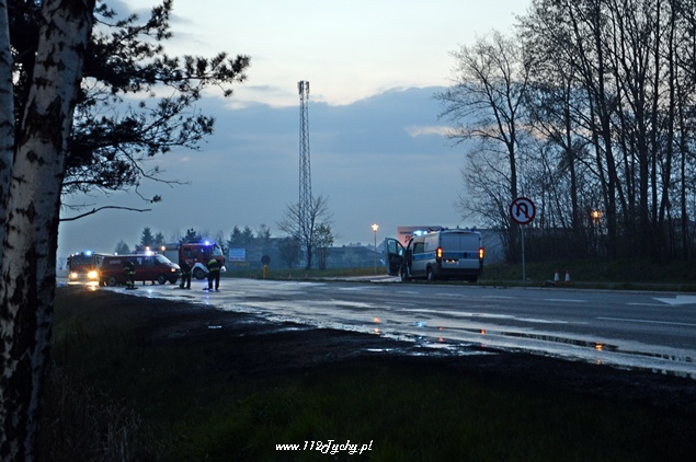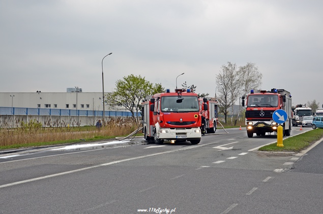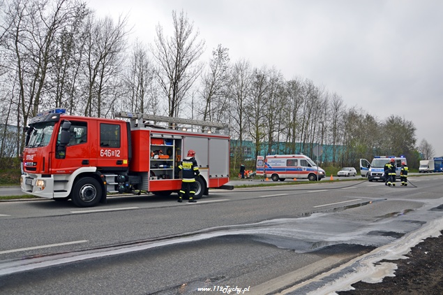 16 kwietnia około godziny 14.30 na ul. Turyńskiej w ciągu DK 44 doszło do groźnego wypadku drogowego. W wypadku udział brały samochód ciężarowy Renault Magnum z naczepą i samochód osobowy Chevrolet Cruze. Po zderzeniu obydwa pojazdy zapaliły się. Na miejsce skierowane zostały trzy zastępy z JRG Tychy (GBA, GCBA, SCRt) i jeden zastęp z ZSP SIRIO (GBA), karetka pogotowia i patrol WRD KMP Tychy.Droga w obydwu kierunkach została całkowicie zablokowana. Kierująca samochodem osobowym w ciężkim stanie została zabrana do szpitala. Kierującemu samochodem ciężarowym nic się nie stało. Dodatkowo wyciekające paliwo spowodowało pożar trawy na poboczu drogi. Działania strażaków polegały dodatkowo na zabezpieczeniu terenu działań oraz pomocy w usuwaniu uszkodzonych pojazdów z drogi. Ze względu na skutki wypadku na miejsce przyjechali również policyjni technicy. Po zakończeniu działań spalone pojazdy zostały usunięte z drogi przez przybyłe na miejsce holowniki. Ze wstępnych ustaleń wynika, że kierujący samochodem ciężarowym zawracał w miejscu niedozwolonym. Dokładniejsze okoliczności tego wypadku wyjaśniają tyscy policjanci. Na miejscu nadal pracują strażacy, którzy przy użyciu sorbentu i sintanu usuwają zanieczyszczenia z jezdni. Ruch w kierunku Bierunia nadal odbywa się objazdami.