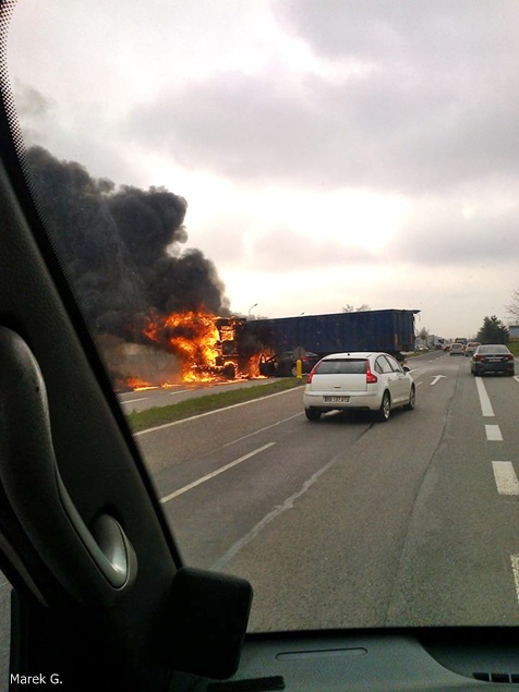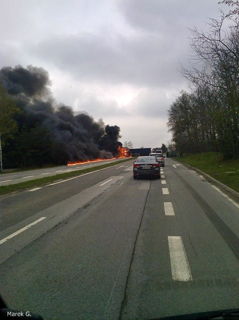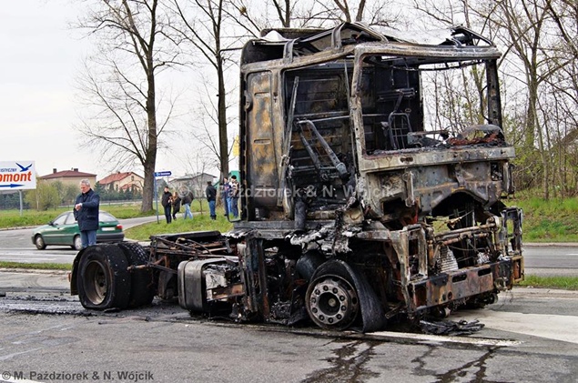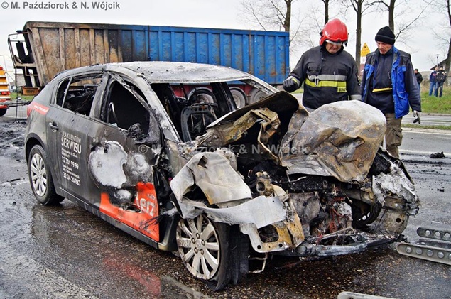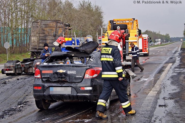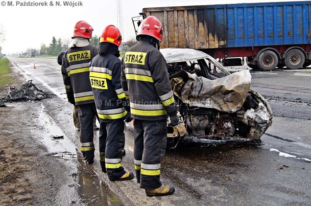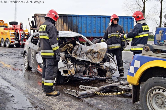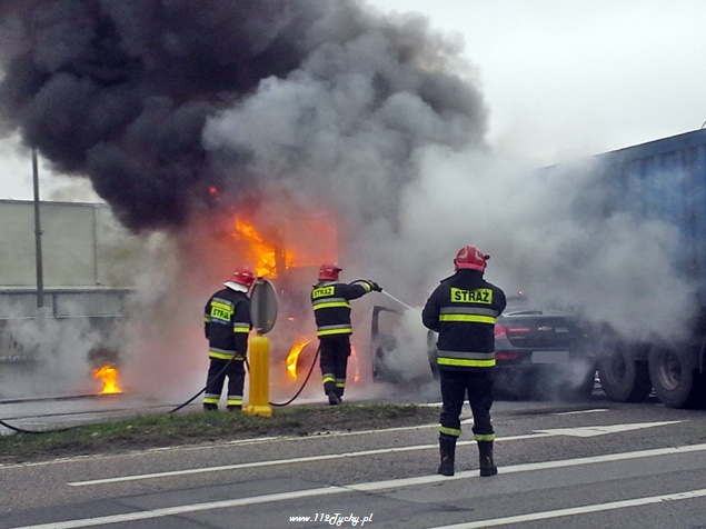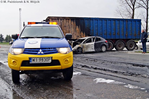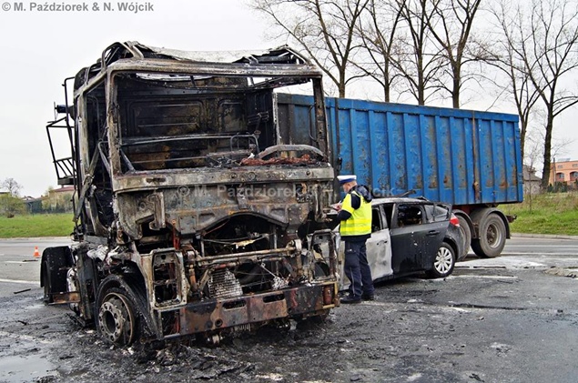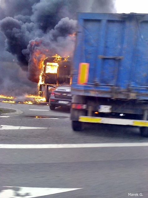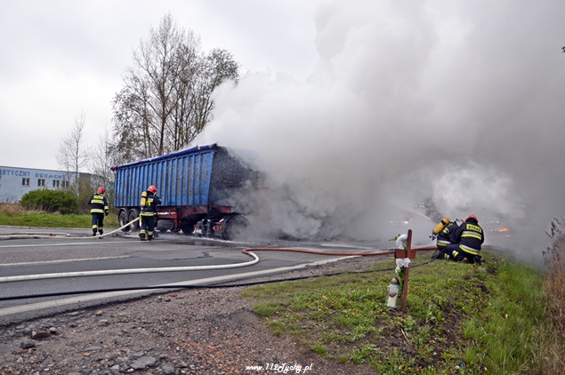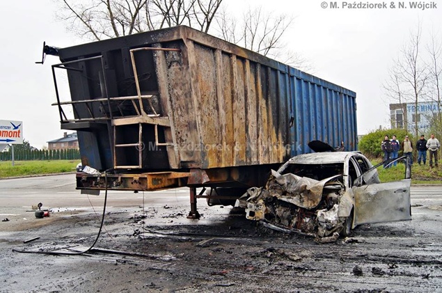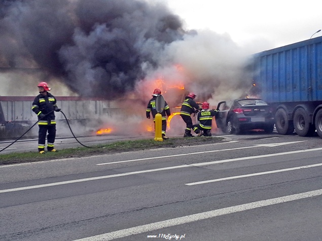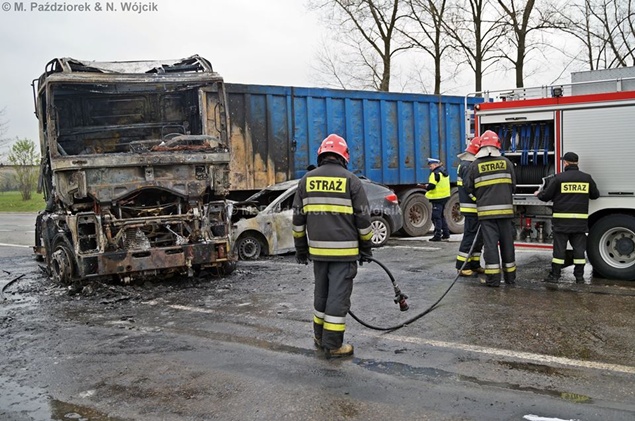 16 kwietnia około godziny 14.30 na ul. Turyńskiej w ciągu DK 44 doszło do groźnego wypadku drogowego. W wypadku udział brały samochód ciężarowy Renault Magnum z naczepą i samochód osobowy Chevrolet Cruze. Po zderzeniu obydwa pojazdy zapaliły się. Na miejsce skierowane zostały trzy zastępy z JRG Tychy (GBA, GCBA, SCRt) i jeden zastęp z ZSP SIRIO (GBA), karetka pogotowia i patrol WRD KMP Tychy.Droga w obydwu kierunkach została całkowicie zablokowana. Kierująca samochodem osobowym w ciężkim stanie została zabrana do szpitala. Kierującemu samochodem ciężarowym nic się nie stało. Dodatkowo wyciekające paliwo spowodowało pożar trawy na poboczu drogi. Działania strażaków polegały dodatkowo na zabezpieczeniu terenu działań oraz pomocy w usuwaniu uszkodzonych pojazdów z drogi. Ze względu na skutki wypadku na miejsce przyjechali również policyjni technicy. Po zakończeniu działań spalone pojazdy zostały usunięte z drogi przez przybyłe na miejsce holowniki. Ze wstępnych ustaleń wynika, że kierujący samochodem ciężarowym zawracał w miejscu niedozwolonym. Dokładniejsze okoliczności tego wypadku wyjaśniają tyscy policjanci. Na miejscu nadal pracują strażacy, którzy przy użyciu sorbentu i sintanu usuwają zanieczyszczenia z jezdni. Ruch w kierunku Bierunia nadal odbywa się objazdami.