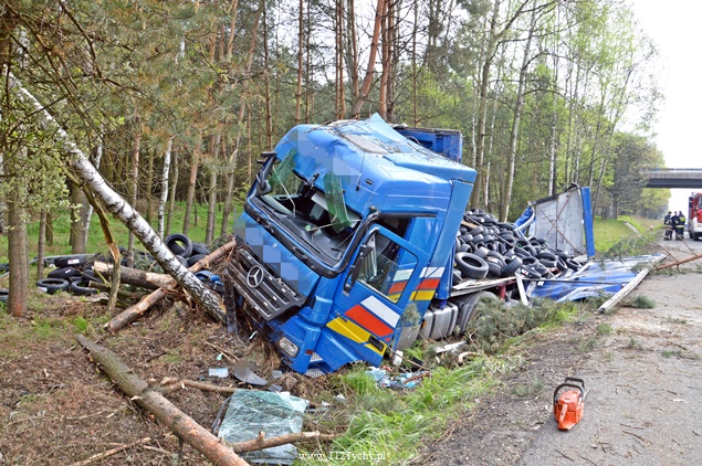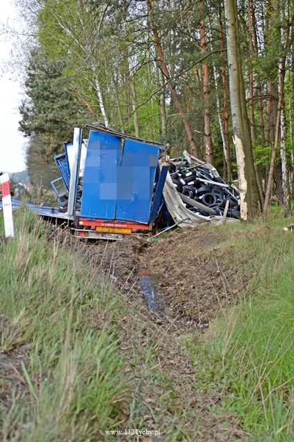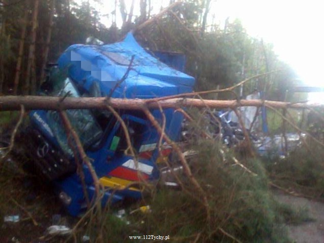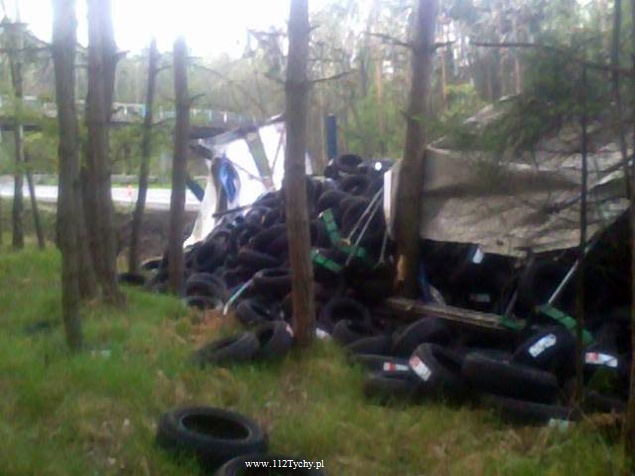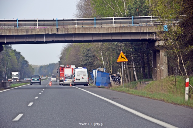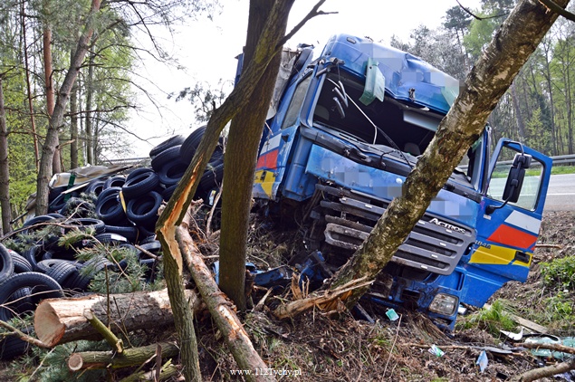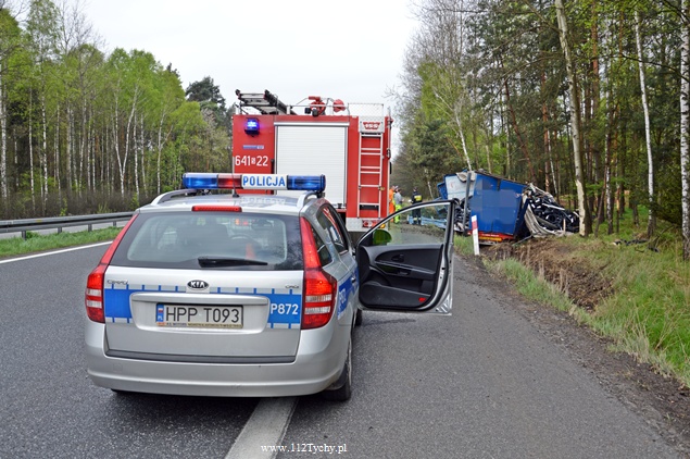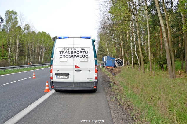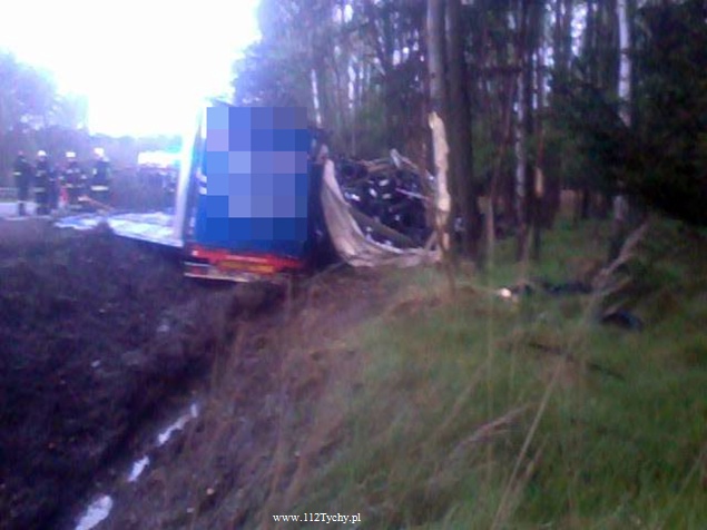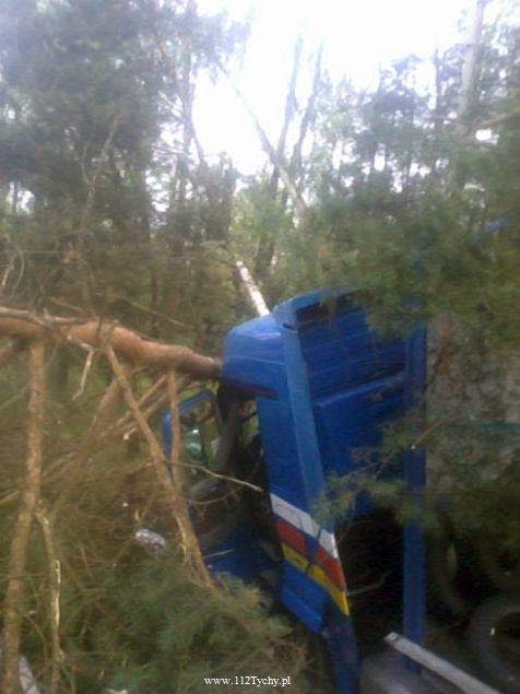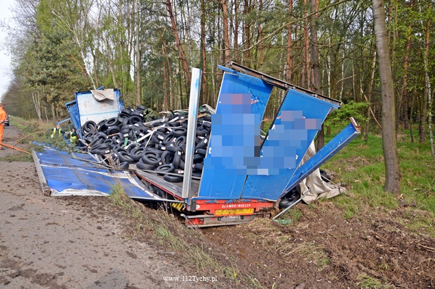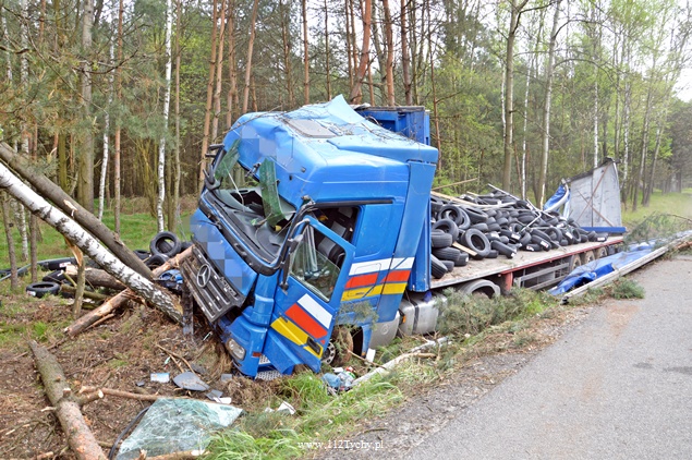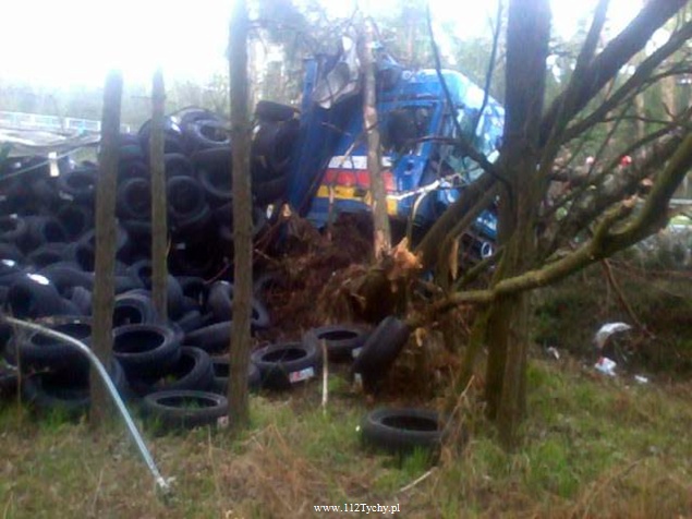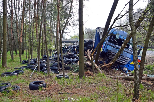 25 kwietnia około godziny 5.40 rano do MSK w Tychach wpłynęło zgłoszenie o zdarzeniu drogowym na trasie S1 w kierunku Tychów. Ze zgłoszenia wynikało, że kierujący samochodem ciężarowym utracił panowanie nad swoim pojazdem i wjechał do przydrożnego rowu ścinając kilka drzew. Na miejsce natychmiast wysłane zostały wszystkie służby. Do akcji ruszyły trzy zastępy z JRG Tychy (GBA, GCBA, SCRt), jeden zastep z OSP Lędziny (GLBA), patrol Policji i ZRM. Po dotarciu na miejsce zgłoszenie potwierdziło się. Służby natychmiast przystąpiły do zabezpieczenia miejsca zdarzenia i udzieleniu pomocy kierowcy. Pomimo dużych zniszczeń kabiny pojazdu, kierujący nie odniósł poważniejszych obrażeń. Jednakże został zabrany do szpitala na dokładniejsze badania. Na miejsce przyjechała również załoga Inspekcji Transportu Drogowego. Jeden pas ruchu w kierunku Tychów został wyłączony z ruchu na czas trwania akcji ratowniczej. Samochód przewoził opony. W chwili obecnej ruch odbywa się płynnie. Jednakże samochód nadal jest w rowie. Na miejsce jedzie już samochód zastępczy, na który zostanie przeładowany cały ładunek i wówczas zostanie podjęta próba wyciągnięcia wraku z rowu. Na czas trwania wyciągania auta z rowu trasa S1 w kierunku Tychów zostanie całkowicie zamknięta dla ruchu. Ze wstępnych ustaleń Policji wynika, ze kierujący nie dostosował prędkości do warunków jazdy. Dalsze dochodzenie prowadzą Policjanci z WRD KMP Tychy. Około północy wszystkie działania zostały zakończone na miejscu i ruch został całkowicie przywrócony.