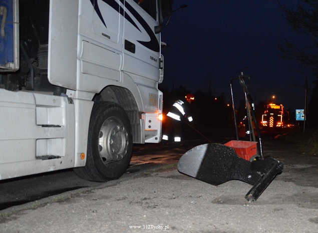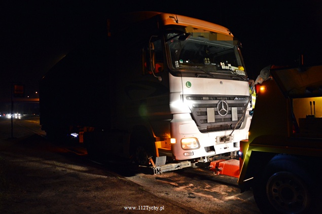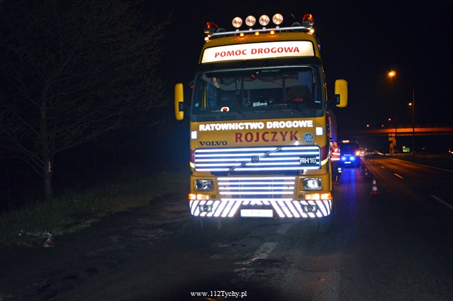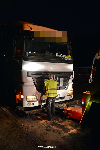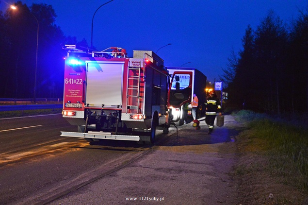 28 kwietnia około godziny 19 do dyżurnego tyskiej Policji wpłynęło zgłoszenie o zdarzeniu drogowym na DK 86. W zdarzeniu brała udział ciężarówka Mercedes z elementem maszyny rolniczej, zgubionej wcześniej przez przejeżdżający tamtędy transport.Kierujący samochodem ciężarowym nie był w stanie uniknąć zderzenia. W wyniku zderzenia uszkodzeniu uległa chłodnica i misa olejowa ciężarówki. Natychmiast na drogę wylały się olej i płyn chłodniczy. Policjanci zabezpieczyli miejsce zdarzenia i na pomoc wezwali tyskich strażaków. Na miejsce udał się jeden zastęp z JRG Tychy (GBA). Działania strażaków polegały na zneutralizowaniu rozlanych płynów eksploatacyjnych. Celem usunięcia uszkodzonego pojazdu na miejsce wezwana została pomoc drogowa. Jeden pas ruchu w kierunku Tychów został wyłączony z ruchu. Około 23 pojazd został przygotowany do transportu. Tyscy Policjanci prowadzą dochodzenie w tej sprawie.