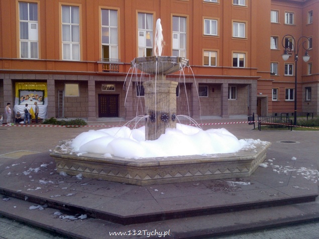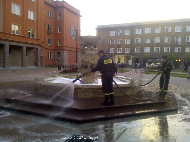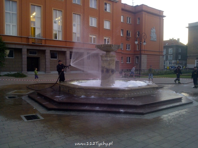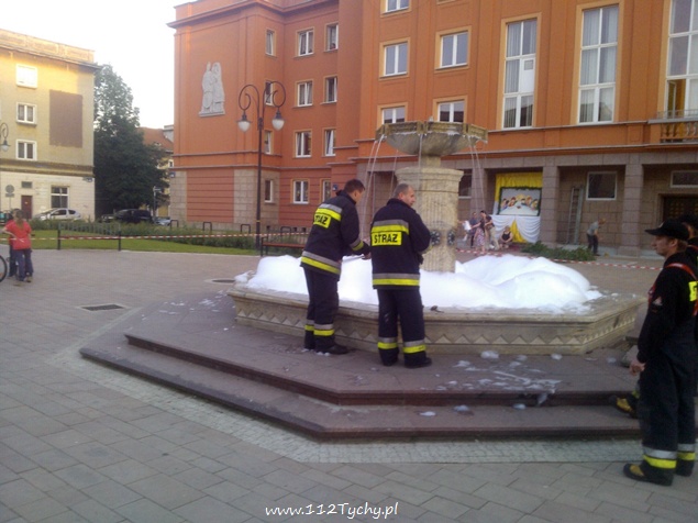 18 czerwca około godziny 20 do dyżurnego tyskiej Straży Pożarnej wpłynęło zgłoszenie, że z fontanny a Placu Św. Anny wydobywa się … piana. Na miejsce wysłany został jeden zastęp z JRG Tychy (GCBA) celem sprawdzenia sytuacji. Po dotarciu na miejsce zgłoszenie się potwierdziło. KDR podjął decyzję o wyznaczeniu strefy bezpiecznej oraz wezwaniu na miejsce strażaków z jednostki chemicznej JRG 2 Katowice Piotrowice. Strażacy z Katowic po kilku minutach byli na miejscu. Przy użyciu specjalistycznego sprzętu wykonali pomiary, które nie wykazały substancji niebezpiecznych. Podjęta została decyzja o konieczności wypłukania fontanny. Przy użyciu linii gaśniczej po kilkunastu minutach było po wszystkim. Na miejscu obecny był również patrol tyskiej Straży Miejskiej. Sprawdzany jest miejski monitoring w celu ujawnienia osoby, która spowodowała tą sytuację.