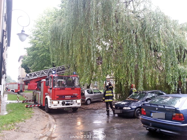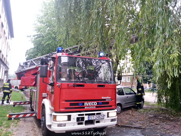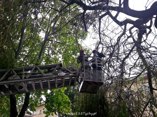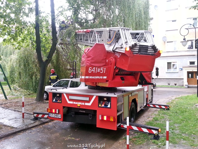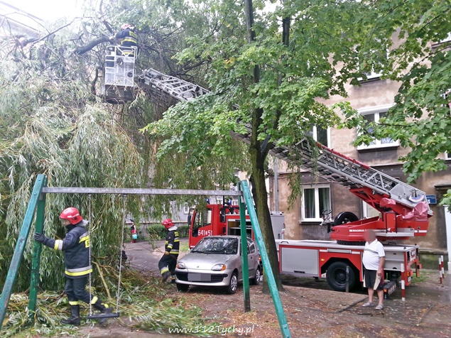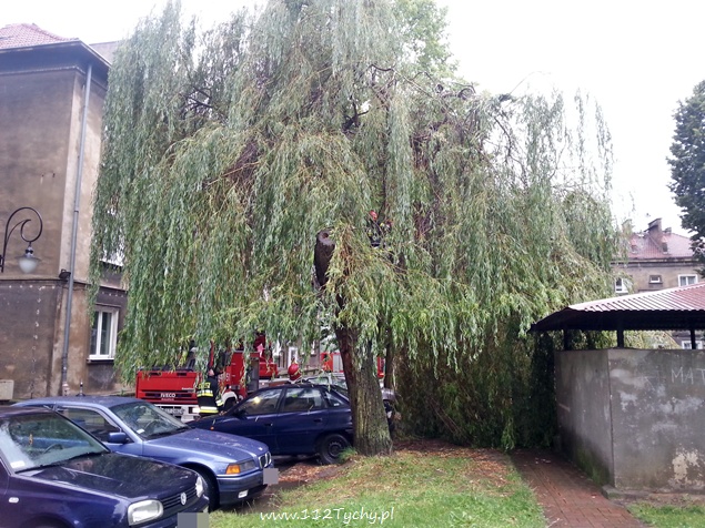 23 lipca około godziny 16.45 do MSK w Tychach wpłynęło zgłoszenie od mieszkańca ul. Asnyka o drzewie zagrażającym przechodzącym ludziom. Na miejsce wysłane zostały dwa zastępy z JRG Tychy (GCBA, SD). Pomimo bardzo utrudnionego dojazdu jak i bardzo małej ilości wolnego miejsca strażacy po rozpoznaniu sytuacji i sprawieniu drabiny mechanicznej przystąpili do działania. Przy użyciu pilarki łańcuchowej poradzili sobie z połamaną wierzbą. Dodatkowym utrudnieniem były zaparkowane po drzewem samochody osobowe. Po prawie godzinie działania zostały zakończone. Ścięte gałęzie zostały ułożone na ziemi i zastępy wróciły do koszar. Nie była to jedyna interwencja po dzisiejszych opadach połączonych z dość silnym wiatrem. Tyscy strażacy kilkakrotnie wyjeżdżali również do zalanych piwnic.
