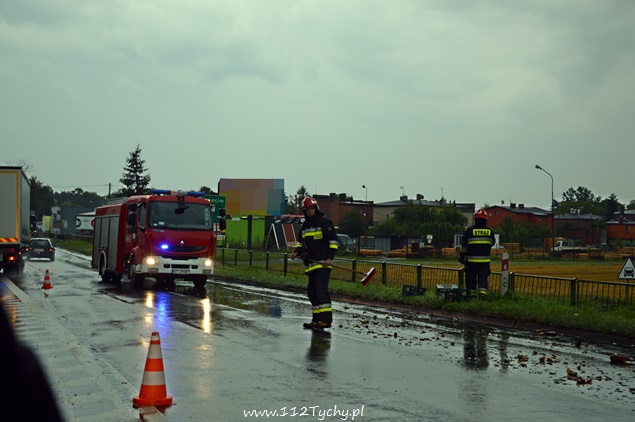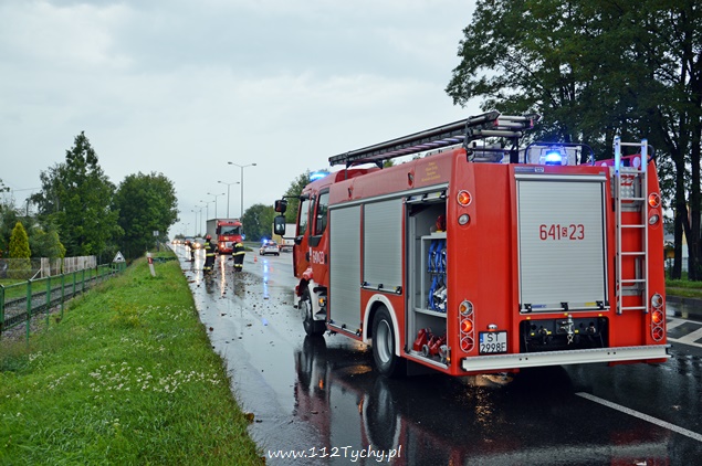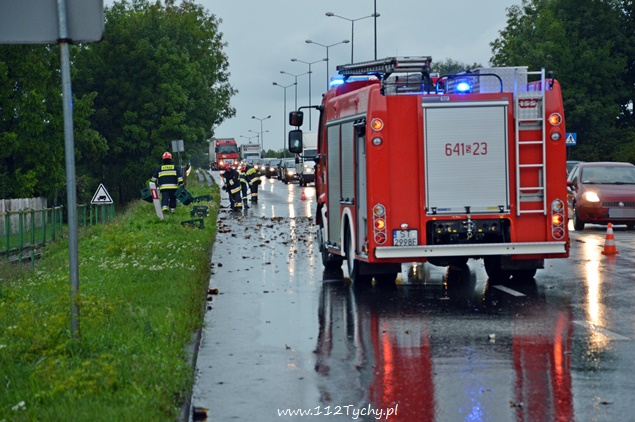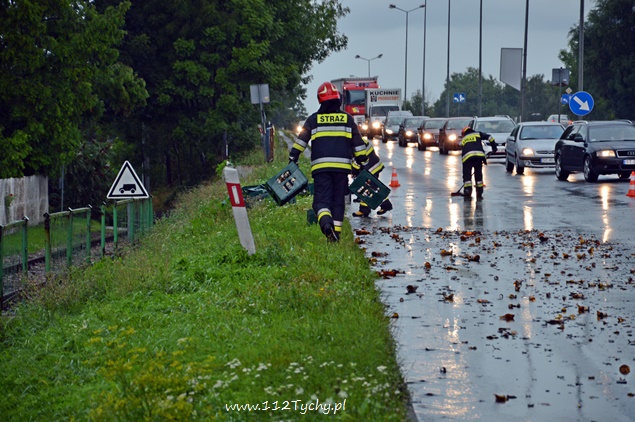 11 sierpnia około godziny 15.20 dyżurny tyskiej Policji otrzymał zgłoszenie, że na ul. Mikołowskiej w ciągu DK 44 na pasie w kierunku centrum miasta leżą skrzynki z piwem, które wypadły z przejeżdżającej ciężarówki. Na miejsce wysłany został patrol Policji oraz jeden zastęp z JRG Tychy (GBA). Na miejscu okazało się, że na drodze leży 25 skrzynek po piwie oraz jest dużo rozbitego szkła. Strażacy po zabezpieczeniu miejsca zdarzenia przystąpili do usuwania stłuczki z drogi przy użyciu mioteł i łopat. Prawy pas ruchu w kierunku centrum miasta został w tym miejscu wyłączony z ruchu, występowały utrudnienia. Kierowca feralnej ciężarówki odjechał z miejsca zdarzenia. Prawdopodobną przyczyną zgubienia ładunku było jego nieprawidłowe zabezpieczenie. Działania trwały około 30 minut. Policja prowadzi dochodzenie w tej sprawie.