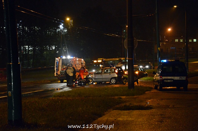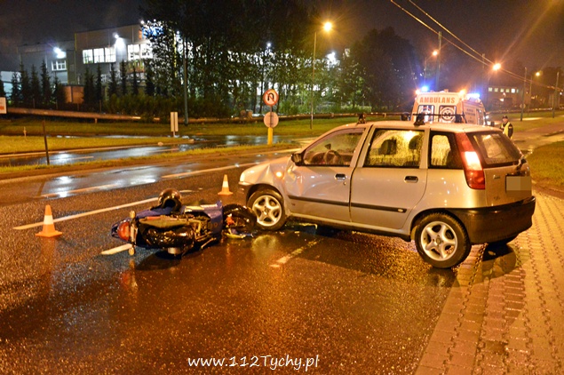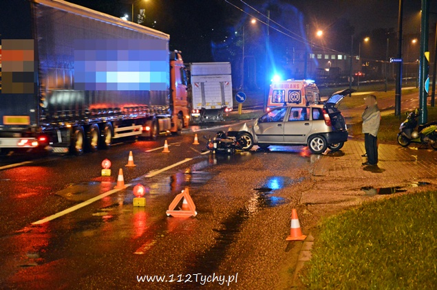 26 sierpnia około godziny 22.05 dyżurny tyskiej Policji otrzymał zgłoszenie z WCPR Katowice o zderzeniu samochodu osobowego ze skuterem na ul. Towarowej w okolicy skrzyżowania z ul. Metalową. Na miejsce wysłany został patrol prewencji celem wykonania wstępnych czynności. Po dotarciu na miejsce funkcjonariusze zastali już ZRM, który opatrywał poszkodowaną kobietę. Kobieta po opatrzeniu została przewieziona do szpitala na dokładniejsze badania. Z uzyskanych informacji w wyniku tego zdarzenia kobieta doznała otwartego złamania nogi. Do przyjazdu patrolu WRD tyskiej Policji miejsce zdarzenia było zabezpieczone sprzętem redakcji naszego portalu. Po dotarciu na miejsce patrolu WRD funkcjonariusze wykonali wstępne czynności. Kierujący samochodem osobowym był trzeźwy. Co do kierującej skuterem nie mamy informacji. Ze względu na obrażenia kobiety kierującej skuterem zdarzenia zostało zakwalifikowane jako wypadek. W związku z powyższym na miejsce wezwany został technik kryminalistyki celem wykonania dodatkowej dokumentacji fotograficznej. Po północy działania funkcjonariuszy na miejscu zdarzenia zostały zakończone. Uszkodzonym skuterem zajęli się przedstawiciele rodziny rannej kobiety, którzy zostali poinformowani o zdarzeniu. Fiat Punto natomiast został odholowany przez pomoc drogową. Dalsze czynności wyjaśniające prowadzą funkcjonariusze KMP Tychy.