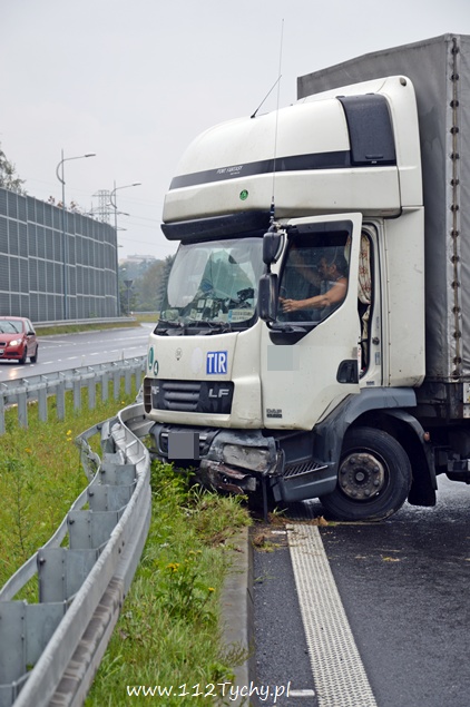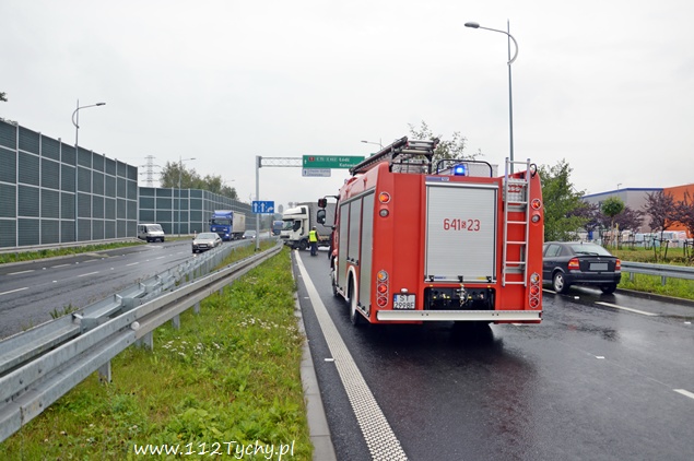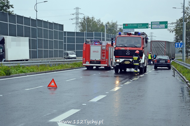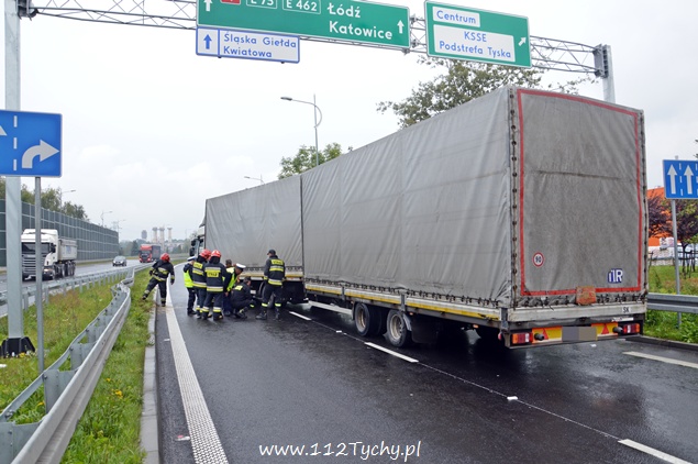 27 sierpnia około godziny 10.30 do MSK w Tychach wpłynęło zgłoszenie o samochodzie ciężarowym blokującym obydwa pasy ruchu trasy DK 1 w kierunku Katowic. Na miejsce wysłane zostały dwa zastępy z JRG Tychy (GBA, SCRt). Po dotarciu na miejsce strażacy zastali samochód ciężarowy Daf z przyczepą ustawiony w poprzek drogi. Zdarzenie miało miejsce na wysokości wyjazdu z marketów OBI i Saturn. Na miejsce wezwany został również patrol tyskiej drogówki. Ze względu na całkowitą blokadę trasy ruch w kierunku Katowic został puszczony ul. Towarową – Metalową – Przemysłową do trasy DK1. KDR podjął decyzję o próbie wyciągnięcia pojazdu przy użyciu zastępu SCRt. Po kilkunastu minutach uszkodzony pojazd był już na prawym pasie. Kierującemu nic się nie stało. Jak ustalili funkcjonariusze Policji kierujący chciał uniknąć zderzenia z samochodem osobowym, który zajechał mu nagle drogę. Wersja ta została również potwierdzona przez świadka zdarzenia. Po około godzinie uszkodzony pojazd zjechał na pobliski parking gdzie oczekuje na specjalistyczny holownik. Ruch został przywrócony. Policjanci KMP Tychy prowadzą dalsze czynności w tej sprawie.