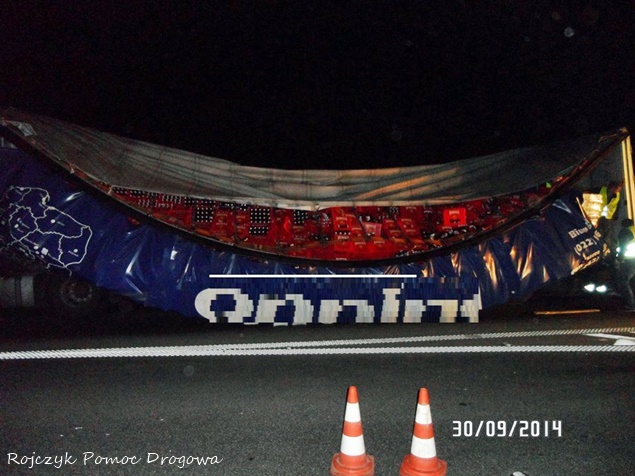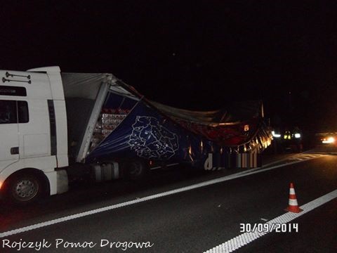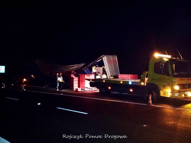 29 września w godzinach nocnych około 22 – 23 na zjeździe z DK 44 na DK 1 w kierunku Katowic doszło do zdarzenia drogowego. W zdarzeniu brała udział samochód ciężarowy z naczepą, na której doszło do przesunięcia się ładunku. Najprawdopodobniej z powodu jego złego zabezpieczenia. Ruch na tym zjeździe został całkowicie zablokowany. Kilka skrzynek z piwem wypadło na drogę. O zdarzeniu poinformowana została także tyska Policja. Na miejsce przyjechała również pomoc drogowa, której zadaniem było przeładowanie ładunku na inny samochód, a następnie odholowanie go w bezpieczne miejsce. Dopiero w godzinach rannych ruch został całkowicie udrożniony a samochód odholowany. Działania Policji polegały na zabezpieczeniu prac prowadzonych przez pomoc drogową. Policja wyjaśnia dokładne okoliczności tego zdarzenia. Podziękowania za zdjęcia dla firmy Rojczyk Pomoc Drogowa.