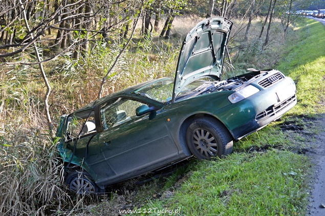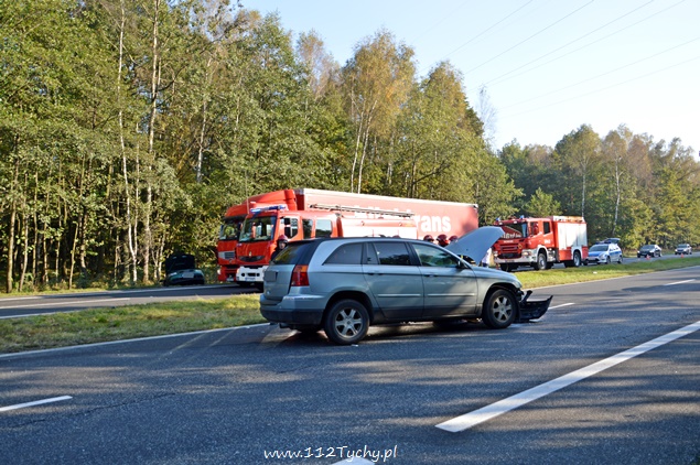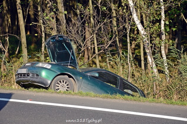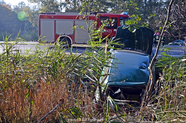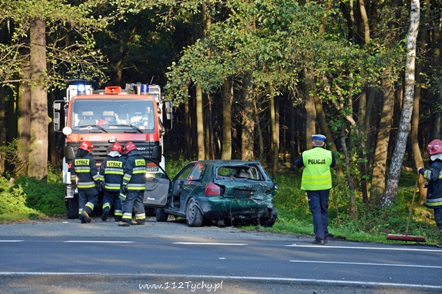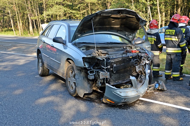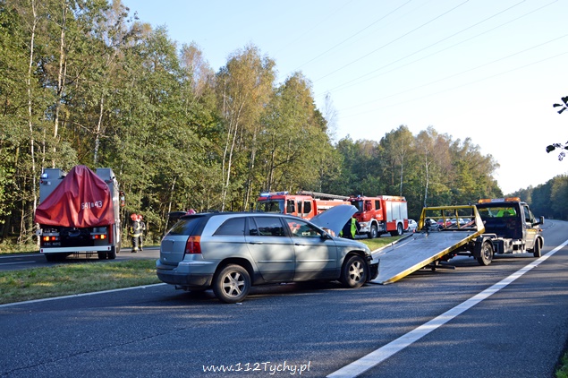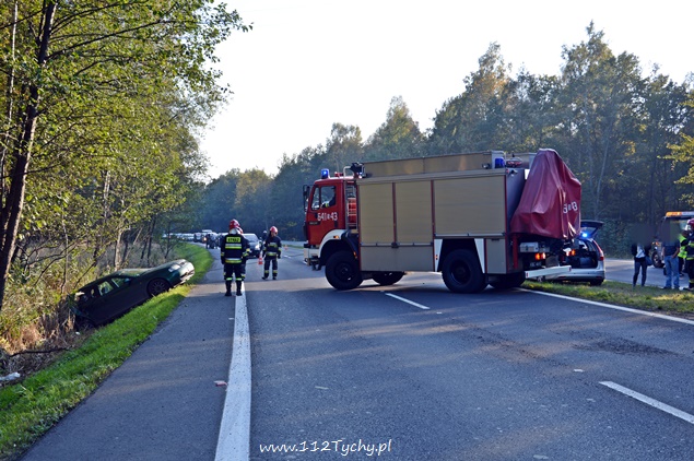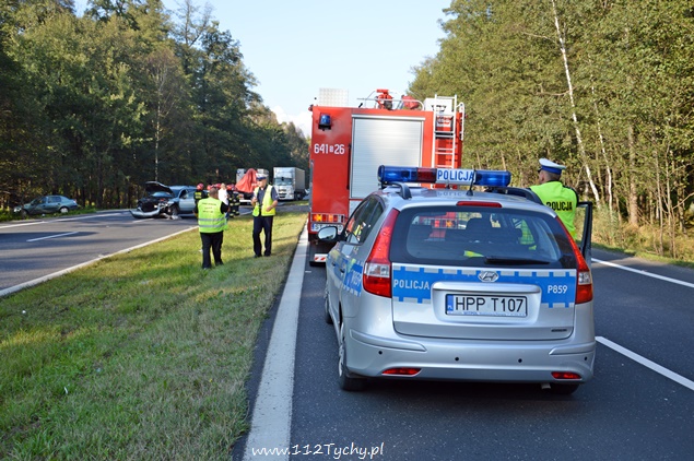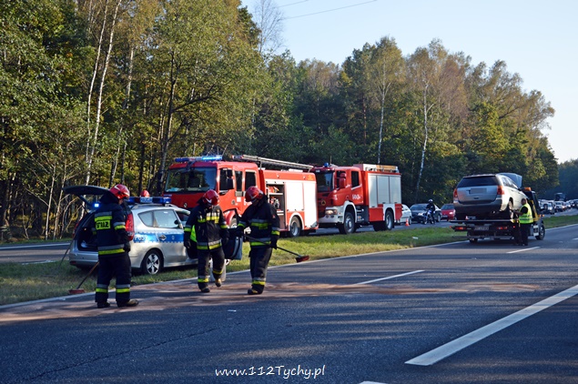 5 października około godziny 14.45 do dyżurnego tyskiej Policji wpłynęło zgłoszenie o zdarzeniu drogowym na DK 86 około kilometra za punktem sprzedaży podnośników w kierunku Katowic. Na miejsce wysłany został jeden z patroli tyskiej drogówki. O zdarzeniu tym poinformowane zostało także pogotowie ratunkowe i tyska Straż Pożarna. Strażacy z JRG Tychy na miejsce wypadku udali się trzema zastępami (GBA, GCBA, SCRt). Po dotarciu na miejsce okazało się, że doszło do zderzenia dwóch samochodów osobowych (Chrysler i Audi). Ze wstępnych ustaleń wynika, że kierujący Chryslerem najechał na tył Audi, a Audi siłą rozpędu przejechało przez dwa pasy w kierunku Katowic i tyłem wpadło do przydrożnego rowu. Na szczęście nikomu z kierujących samochodami nic się nie stało. Kierujący pojazdami byli trzeźwi. Skończyło się na mocno uszkodzonych pojazdach. Działania strażaków polegały na zabezpieczeniu miejsca zdarzenia, odłączeniu zasilania w obydwu pojazdach, wyciągnięciu Audi z przydrożnego rowu oraz neutralizacji rozlanych płynów eksploatacyjnych. Na czas trwania działań ratowniczych lewe pasy w obu kierunkach były wyłączone z ruchu. W trakcie usuwania uszkodzonych pojazdów ruch na DK 86 w obu kierunkach był całkowicie wstrzymany. Utrudnienia trwały około dwóch godzin. Tyscy Policjanci prowadzą dochodzenie w tej sprawie.