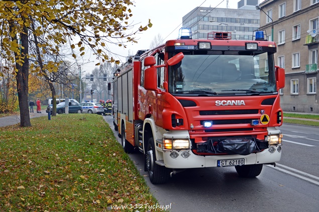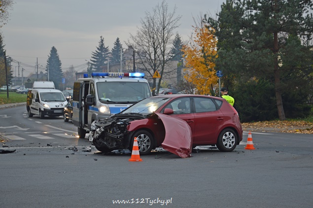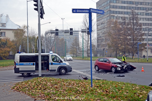 7 listopada przed godziną 8 na skrzyżowaniu ulic Budowlanych i Burschego doszło do zdarzenia drogowego. W zdarzeniu brały udział dwa samochody osobowe: Ford i Hyundai. Na miejsce wysłane zostały patrole tyskiej Policji, ZRM i trzy zastępy z JRG Tychy ( GBA, GCBA, SCRt). Poszkodowane zostały dwie osoby podróżujące jednym z samochodów. Osoby poszkodowane zostały zabrane do szpitala. Ze wstępnych ustaleń funkcjonariuszy „drogówki” wynika, że jeden z kierujących wjechał na skrzyżowanie na czerwonym świetle. W wyniku tego doszło do zderzenia czołowo – bocznego tych pojazdów. Ford siłą uderzenia został odrzucony na pobliski trawnik. Przejechał on przez chodnik – na szczęście nie nikogo na nim nie było. Ze względu na rodzaj zdarzenia i zakwalifikowanie go jako wypadek na miejsce wezwany został technik kryminalistyki. W czasie trwania działań służb ratowniczych na miejscu występowały utrudnienia w ruchu, a ruchem kierowali Policjanci. Działania strażaków polegały na zabezpieczeniu miejsca zdarzenia, odłączeniu akumulatorów w rozbitych pojazdach oraz uprzątnięciu i neutralizacji rozlanych płynów eksploatacyjnych. Tyscy Policjanci prowadzą dochodzenie w tej sprawie.