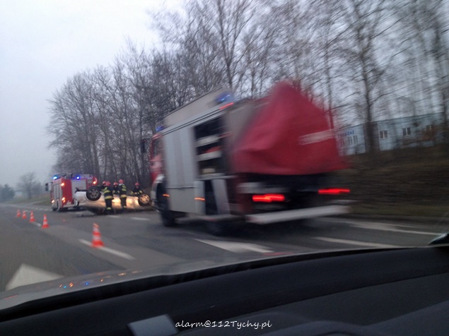 26 listopada około godziny 5.40 dyżurny tyskiej Straży Pożarnej otrzymał zgłoszenie z WCPR Katowice o dachowaniu samochodu osobowego na ul. Turyńskiej w ciągu DK 44 na pasie w kierunku centrum miasta. Na miejsce wysłane zostały dwa zastępy z JRG Tychy (GBA, SCRt), ZRM oraz dwa patrole tyskiej Policji. Po dotarciu na miejsce ratownicy zastali samochód Opel Vectra leżący na dachu i uwięzionego w nim 23-letniego kierowcę. Działania polegały na wydobyciu osoby poszkodowanej z pojazdu, udzielenie jej KPP, zabezpieczeniu miejsca zdarzenia wraz z jego oświetleniem. Poszkodowany kierujący został przekazany przybyłemu na miejsce ZRM. Kierujący został zabrany do szpitala na dalsze badania. W czasie tych działań ruch w kierunku centrum był całkowicie wstrzymany. Po wykonaniu odpowiedniej dokumentacji przez przybyłych na miejsce policjantów, strażacy postawili uszkodzony pojazd na koła i zneutralizowali rozlane płyny eksploatacyjne. Ruch został puszczony jednym pasem. Tyscy Policjanci wyjaśniają zaistniałe zdarzenie.