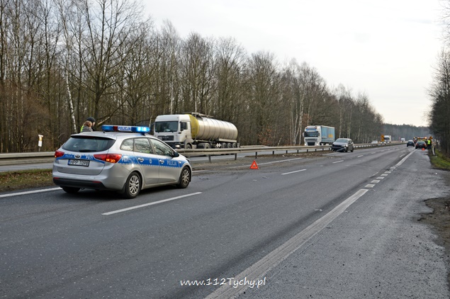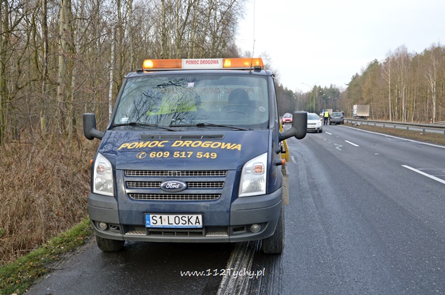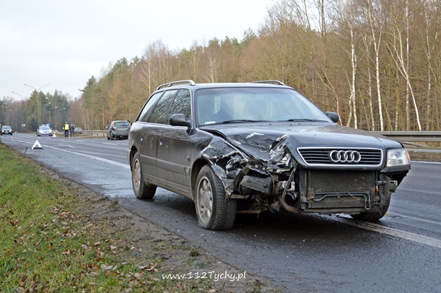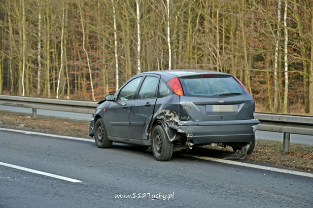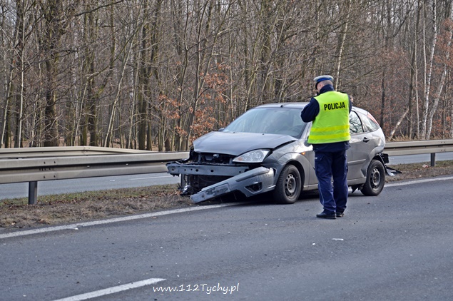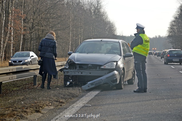 11 grudnia około godziny 11.30 dyżurny tyskiej Policji otrzymał zgłoszenie od jednego z kierowców o zdarzeniu drogowym na DK 86 na pasie w kierunku Bielska Białej. Z informacji przekazanych przez kierujących w zdarzeniu miały brać udział dwa samochody osobowe. Na miejsce zdarzenia wysłany został jeden z patroli WRD. Po dotarciu na miejsce okazało się, że lewy pas w kierunku Bielska Białej jest całkowicie nieprzejezdny z powodu rozsypanych elementów plastikowych oraz naniesionej ziemi z pasa zieleni. Z informacji uzyskanych na miejscu zdarzenia wynika, że osoba kierująca samochodem Ford nie sprawdzając czy ma wolny lewy pas zajechała drogę jadącemu za nią kierującemu samochodem Audi. Ford uderzony w tył wykonał kilka obrotów odbijając się od barierek i zatrzymał się blokując lewy pas. Rozbite Audi zatrzymało się na poboczu. Przez ponad dwie godziny lewy pas w miejscu zdarzenia był wyłączony z ruchu. O zdarzeniu poinformowany został zarządca drogi oraz tyska straż pożarna. Strażacy po dotarciu na miejsce usunęli rozbitego Ford-a na pobocze oraz uprzątnęli pas drogi. Policja prowadzi dochodzenie w tej sprawie.
