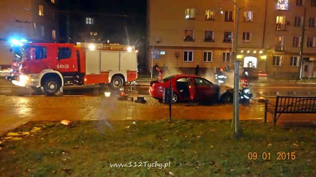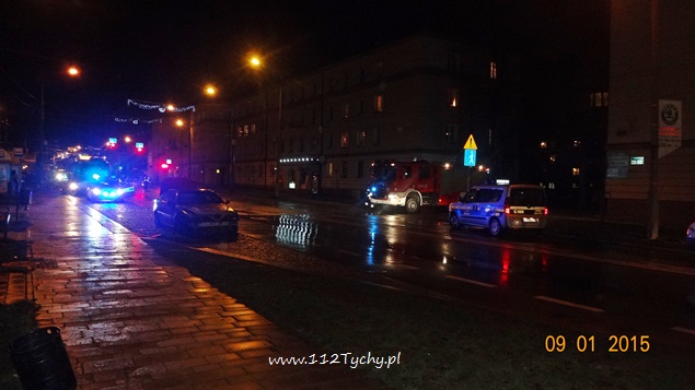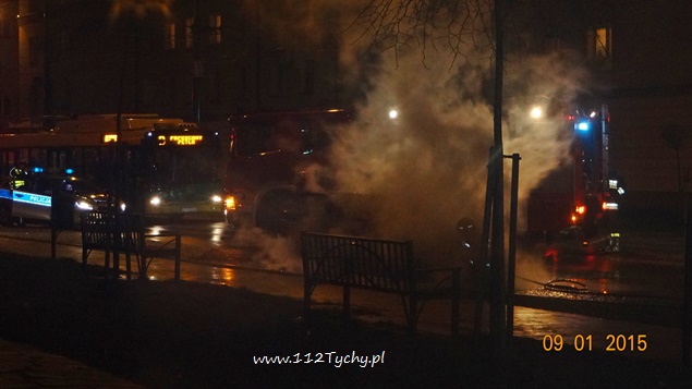9 stycznia około godziny 17:50 do MSK Tychy wpłynęło zgłoszenie o pożarze samochodu osobowego na ul. Budowlanych. Na miejsce został wysłany jeden zastęp z JRG Tychy (GCBA). W trakcie dojazdu d-ca zastępu został poinformowany o dodatkowym zdarzeniu – zerwaniu trakcji trolejbusowej na pobliskim skrzyżowaniu ulic Budowlanych z Begonii. Po dotarciu na miejsce okazało się, że pali się samochód osobowy marki Alfa Romeo, a trakcją zajmują się już pracownicy pogotowia awaryjnego TLT. Pożarem objęta była komora silnika. Działania strażaków polegały na odłączeniu akumulatora oraz zabezpieczeniu instalacji LPG. W tym samym czasie na skrzyżowaniu i w miejscu pożaru samochodu ruchem kierowali funkcjonariusze WRD tyskiej Policji. Po około 40 minutach strażacy, policjanci i pracownicy pogotowia awaryjnego zakończyli swoje działania. Ruch odbywa się już normalnie.