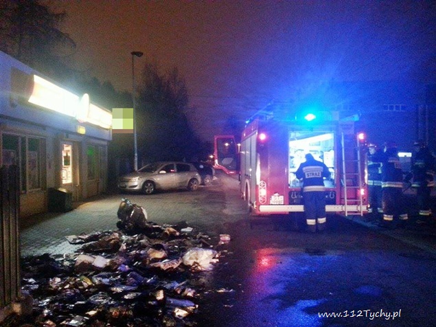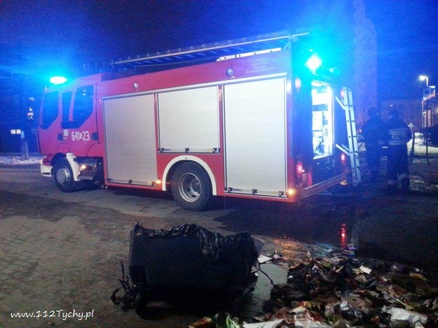 6 lutego około godziny 18.05 do MSK w Tychach wpłynęło zgłoszenie o pożarze plastikowego pojemnika na śmieci zlokalizowanego przy jednym ze sklepów przy ul. Skalnej. Na miejsce wysłany został jeden zastęp z JRG Tychy (GBA). Po dotarciu na miejsce okazało się, że spaleniu uległ pojemnik na śmieci, a okopceniu uległa elewacja przylegającego budynku. Przy użyciu szybkiego natarcia strażacy szybko poradzili sobie z zagrożeniem. Dodatkowo śmieci zostały przelane i przerzucone. Spaleniu – stopieniu uległ pojemnik na śmieci. Po około 20 minutach działania zostały zakończone i zastęp został przedysponowany do kolejnej interwencji, tym razem w Lędzinach.