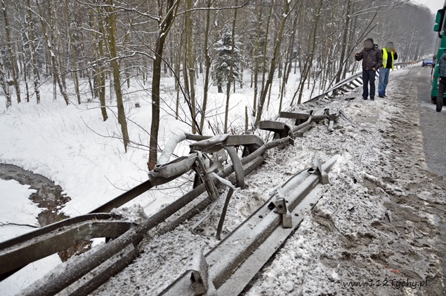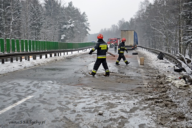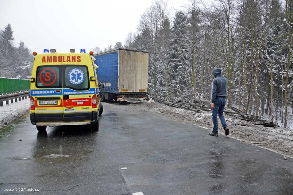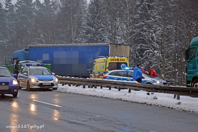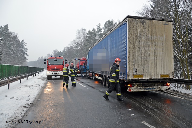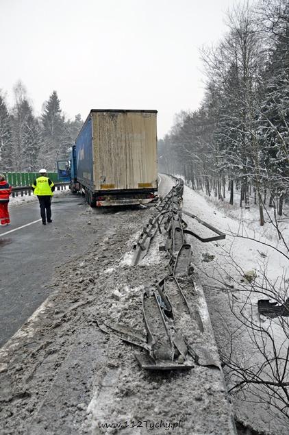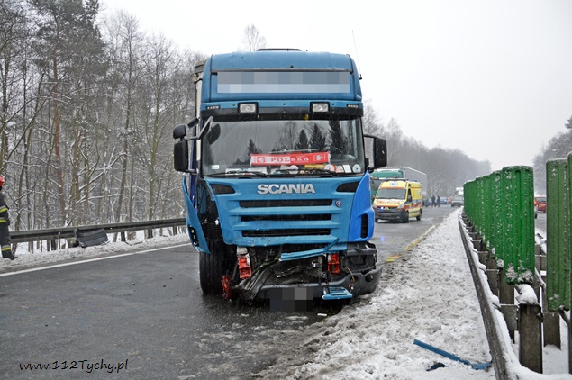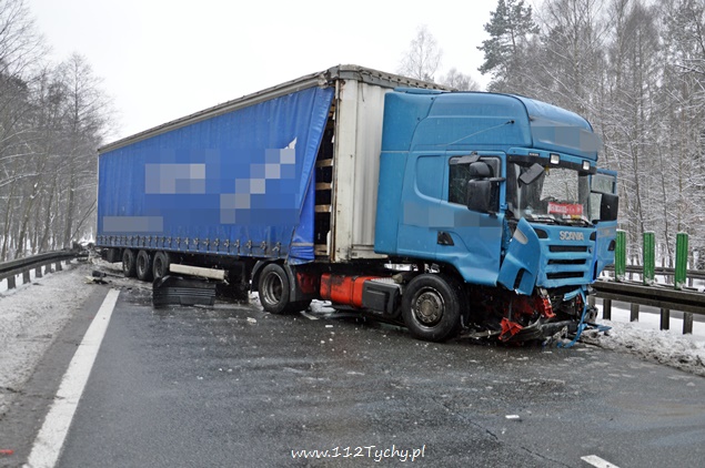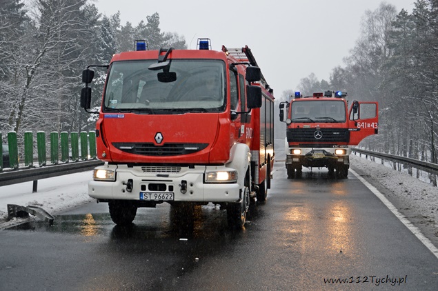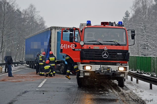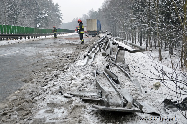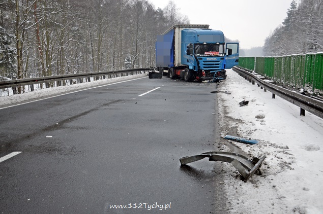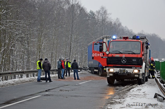 9 lutego około godziny 14.45 dyżurny tyskiej Policji został poinformowany o zdarzeniu drogowym na DK 86 na pasie w kierunku Katowic (około 1km za salonem Toyoty)gdzie samochód ciężarowy Scania z naczepą zablokował dwa pasy ruchu. Na miejsce wysłany został patrol drogówki oraz poinformowana została tyska straż pożarna. Po dotarciu na miejsce okazało się, że kierowca samochodu ciężarowego z niewyjaśnionych przyczyn utracił panowanie nad swoim pojazdem i uderzył w barierki mocno uszkadzając swój pojazd i stając w poprzek drogi, czym całkowicie zablokował ruch. W miejscu zdarzenia utworzył się kilkukilometrowy korek. W korku utknęła również karetka pogotowia jadąca do pacjenta. Zastępy z JRG Tychy (GBA, SCRt) dojechały do zdarzenia po kilku minutach od zgłoszenia. Działania strażaków polegały na zabezpieczeniu miejsca zdarzenia, usunięciu elementów uszkodzonego samochodu ciężarowego jego usunięciu oraz neutralizacji przy użyciu Sorbentu i Sintanu znacznych ilości oleju napędowego rozlanego na jezdni. Przez ponad półtorej godziny ruch był całkowicie zablokowany. Po usunięciu pojazdu ruch został puszczony lewym pasem. Na czas trwania działań Policja kierowała samochody na objazdy trasą S – 1 w kierunku Katowic. Uszkodzony samochód został odholowany przez przybyłą na miejsce pomoc drogową. Tyscy Policjanci prowadzą dochodzenie w tej sprawie.