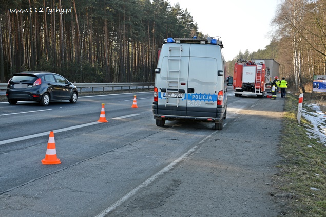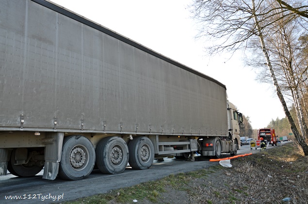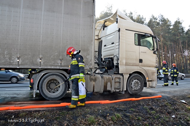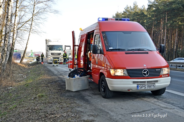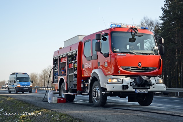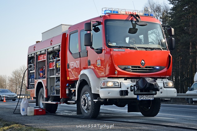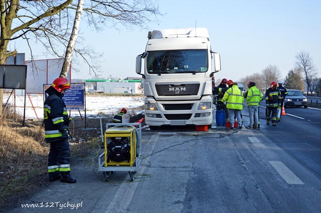 17 lutego około godziny 10:15 do dyżurnego PSP Pszczyna wpłynęło zgłoszenie od kierującego pojazdem ciężarowym MAN o wycieku paliwa ze zbiornika. Zdarzenie miało miejsce na trasie DK 1 w Kobiórze na pasie w kierunku Bielska Białej na wysokości stacji paliw BP. Na miejsce zostały zadysponowane 2 zastępy z JRG Pszczyna (GBA, SLRChem). Działania strażaków polegały na przepompowaniu paliwa do zbiorników zastępczych oraz zabezpieczeniu miejsca zdarzenia. Dodatkowo strażacy przy użyciu Sintanu i Sorbentu zneutralizowali rozlane paliwo. Na czas prowadzenia działań prawy pas w kierunku Bielska Białej był wyłączony z ruchu. Kierujący samochodem ciężarowym poinformował, że do uszkodzenia zbiornika mialo dojść gdy najechał na jakiś przedmiot leżący na drodze. Na miejscu pracowali również Policjanci z WRD KPP w Pszczynie.