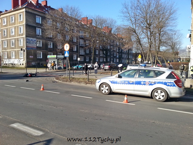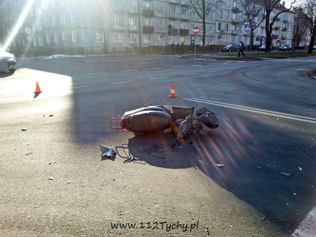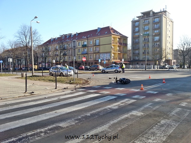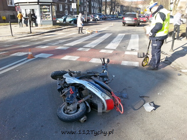 20 lutego po godzinie 9 na skrzyżowaniu al. Bielskiej z ul. Czarnieckiego doszło do zdarzenia drogowego. W zdarzeniu brało udział Audi i skuter. Na miejsce skierowane zostały dwa patrole drogówki tyskiej Policji oraz ZRM. Kierujący skuterem mężczyzna został zabrany do szpitala na dokładną diagnozę. Z ustaleń pracujących na miejscu Policjantów wynika, że kierująca samochodem Audi nie ustąpiła pierwszeństwa przejazdu kierującemu skuterem (Audi przejeżdżało od ul. Cyganerii, a skuter jechał al. Bielską). W wyniku zdarzenia prawy pas al. Bielskiej w kierunku AUCHAN został wyłączony z ruchu oraz pas ul. Czarnieckiego. W związku z rodzajem zdarzenia na miejsce wezwany został policyjny technik. Policjanci prowadzą dochodzenie w tej sprawie.