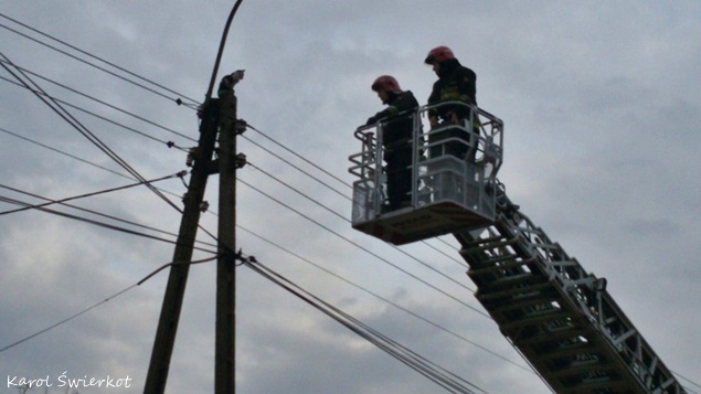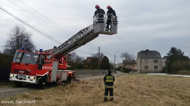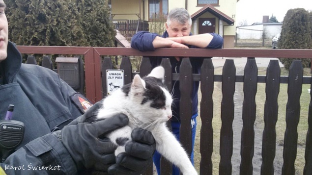 22 lutego po godzinie 14 do dyżurnego tyskiej Straży Pożarnej wpłynęło zgłoszenie od mieszkańca Lędzin, że na jednym ze słupów energetycznych siedzi wystraszony kot. Kot siedział na słupie przy ul. Miłosza. Na pomoc kociakowi wysłane zostały zastępy z OSP Lędziny (GBA) i JRG Tychy (GBA, SD). Po dotarciu na miejsce i sprawieniu drabiny mechanicznej strażacy szybko uwolnili kota z potrzasku. Został przekazany właścicielowi.