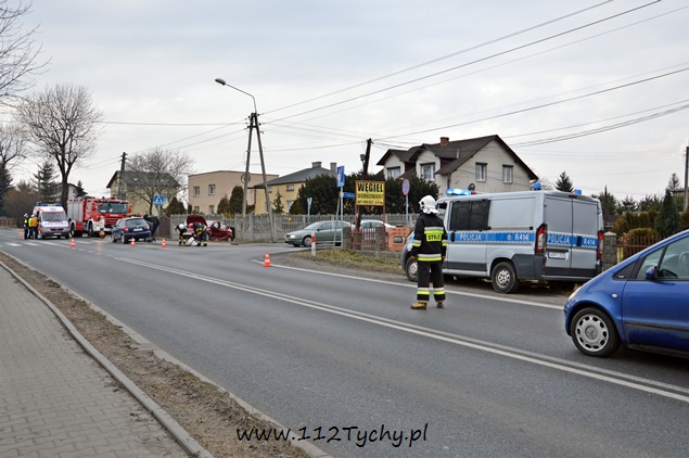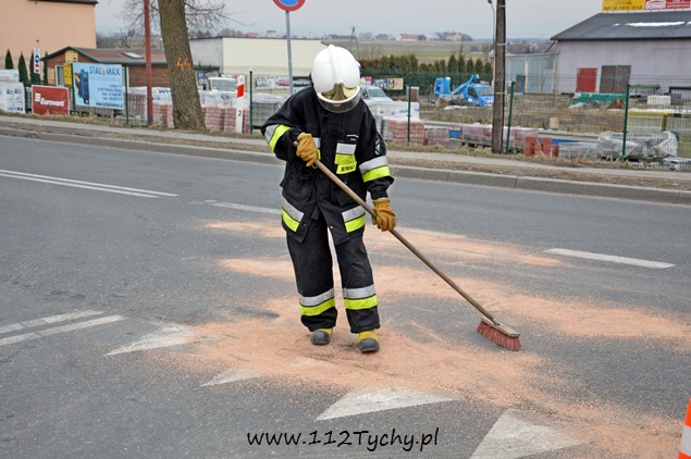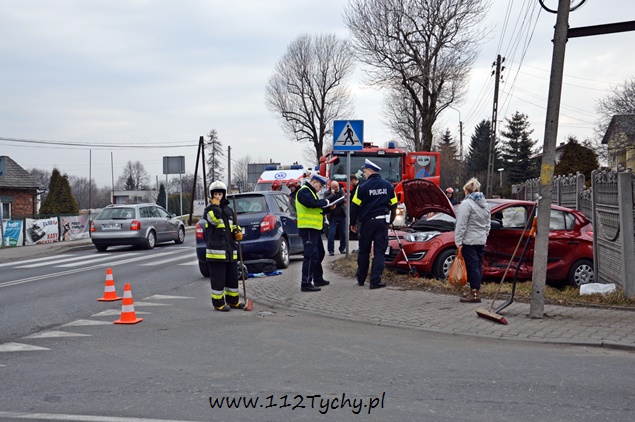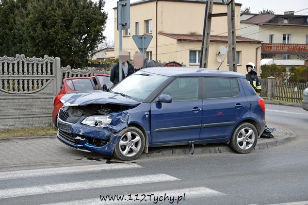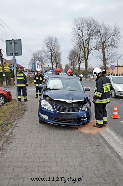 22 lutego około godziny 14.15 do MSK w Tychach wpłynęło zgłoszenie o plamie płynów eksploatacyjnych po kolizji na skrzyżowaniu ulic Warszawskiej z Bogusławskiego w Bieruniu. Na miejsce wysłane zostały zastępy z OSP Bieruń Nowy (GBARt) i JRG Tychy (GCBA). Po dotarciu na miejsce zastępów okazało się, że doszło do zderzenia czołowo bocznego Skody z Hyuandai-em. Hyundai siłą uderzenia został odrzucony na betonowe ogrodzenie z jednej z przyległych posesji. Kierująca Hyundai-em kobieta została wydobyta z samochodu przez strażaków i przekazana przybyłemu na miejsce ZRM. Kobieta została odwieziona do szpitala w Tychach na dalsze badania. Przez około godzinę w miejscu zdarzenia występowały utrudnienia w ruchu. Ruchem kierowali strażacy. Na miejscu pracowali również policjanci z KPP w Bieruniu.