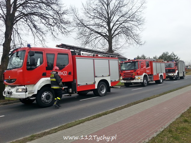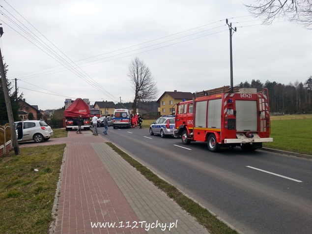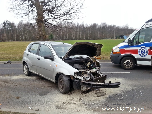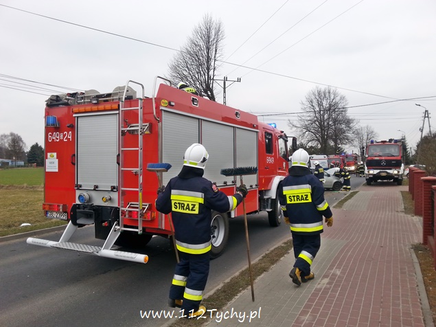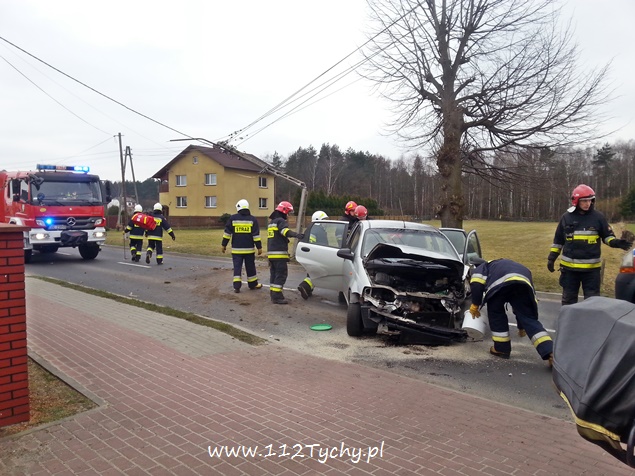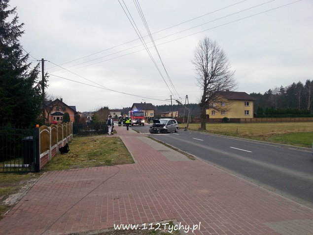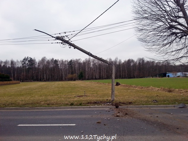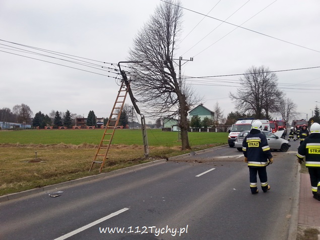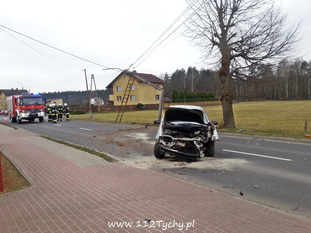 22 marca około godziny 12.50 do MSK w Tychach wpłynęło zgłoszenie o wypadku drogowym w Świerczyńcu na ul. Barwnej. Na miejsce zadysponowane zostały zastępy z OSP Świerczyniec (GBA), OSP Bojszowy (GBA) i JRG Tychy (GBA, GCBA, SCRt), ZRM oraz patrol bieruńskiej „drogówki”. Po dotarciu na miejsce okazało się, że kierujący samochodem Chevrolet Aveo utracił panowanie nad swoim pojazdem i z ogromną silą uderzył w słup energetyczny – łamiąc go. Jak się okazało pojazdem podróżowały dwie osoby. Jedna przez przyjazdem służb oddaliła się z miejsca. Osoba, która została na miejscu poinformowała, że to ona kierowała pojazdem. Jak się okazało po zbadaniu stanu trzeźwości – miała ponad DWA PROMILE w wydychanym powietrzu. W znacznym stopniu ten stan przyczynił się do spowodowania zagrożenia. Strażacy poza zabezpieczeniem miejsca zdarzenia, odłączeniu akumulatora i neutralizacji płynów eksploatacyjnych musieli dodatkowo zabezpieczyć uszkodzony słup energetyczny. Zabezpieczenie wykonali przy użyciu dwóch przęseł drabiny słupkowej. Na miejsce wezwane zostało pogotowie energetyczne. Ruch na ul. Barwnej w miejscu zdarzenia został całkowicie wstrzymany. Strażacy kierowali ruchem. Bieruńska Policja prowadzi dochodzenie w sprawie tego zdarzenia.