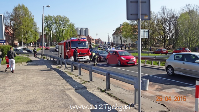 25 kwietnia około godziny 8.25 na al. Bielskiej przy targowisku doszło do kolizji dwóch samochodów osobowych. Na tył zatrzymującego się przed oznakowanym przejściem dla pieszych Hyundaia najechało Daewoo. Na szczęście nikomu nic się nie stało. Skończyło się na uszkodzonych pojazdach. Na miejsce wezwany został patrol drogówki i jeden zastęp z JRG Tychy (GBA) celem zabezpieczenia miejsca kolizji i neutralizacji plamy płynów eksploatacyjnych. Przez około 30 minut prawy pas w kierunku ul. Budowlanych był zablokowany. Policjanci prowadzą dalsze czynności w sprawie tej kolizji.