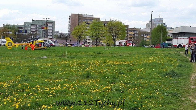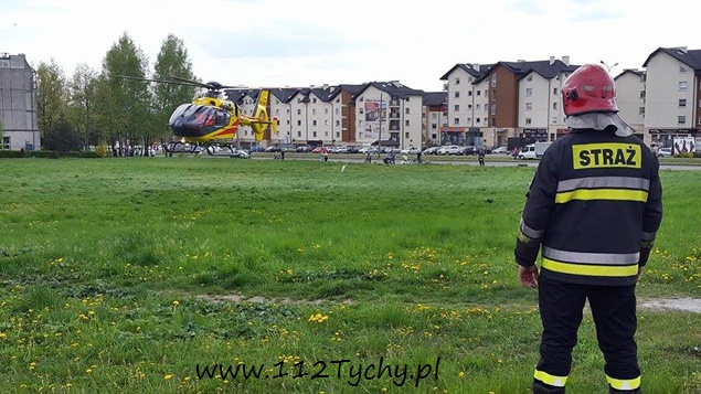 27 kwietnia około godziny 13.20 dyżurny tyskiej Straży Pożarnej otrzymał zgłoszenie z WCPR Katowice, że w okolicy oś. K (skrzyżowanie ulic Sikorskiego – Stoczniowców – Al. Bielskiej) będzie lądował śmigłowiec LPR – Ratownik 6. Na miejsce wysłane zostały dwa zastępy z JRG Tychy (GBA, SLRt) celem zabezpieczenia lądowiska. Jak się okazało, śmigłowiec został wezwany przez załogę pogotowia ratunkowego do mężczyzny, który z posiadanych informacji wcześniej zasłabł, a upadając doznał urazu głowy. Mężczyzna został przetransportowany do szpitala św. Barbary w Sosnowcu. Ruch w okolicy skrzyżowania był utrudniony przez kilkanaście minut na czas lądowania i startu latającej karetki.