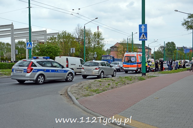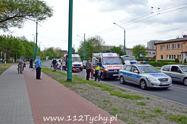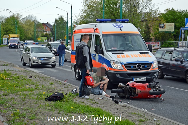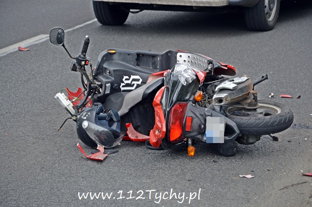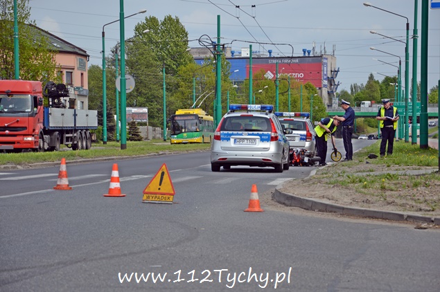 5 maja około godziny 13:35 do dyżurnego KMP Tychy wpłynęło zgłoszenie o potrąceniu pieszej na al. Piłsudskiego w okolicach skrzyżowania z ul. Jordana i Poziomkową w kierunku terenow przemysłowych. Na miejsce zostały skierowane podległe patrole policji oraz ZRM. Po przybyciu na miejsce okazało się, że doszło do potrącenia kobiety przez kierującego skuterem. Ucierpiała nie tylko piesza ale również kierujący skuterem. Z relacji świadków zdarzenia wynika, że do potrącenia doszło, gdy kierujący samochodem osobowym jadący lewym pasem zatrzymał się przed oznakowanym przejściem celem ustąpienia pierwszeństwa pieszej, a jadący prawym pasem, kierowca skutera, nie zatrzymał się i doprowadził do potrącenia. Poszkodowana kobieta jak i sprawca zdarzenia byli trzeźwi i zostali przewiezieni do szpitala na dalsze badania. Po sprawdzeniu w bazach danych okazało się, że kierujący skuterem nie posiada ważnej polisy OC na swój pojazd. Na miejsce dodatkowo został wysłany technik kryminalistyki celem wykonania odpowiedniej dokumentacji. Dalsze czynności wyjaśniające będą prowadzone przez policjantów KMP Tychy. Na czas trwania działań prawy pas w miejscu zdarzenia został wyłączony z ruchu co powodowało dość duże utrudnienia w ruchu.
