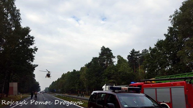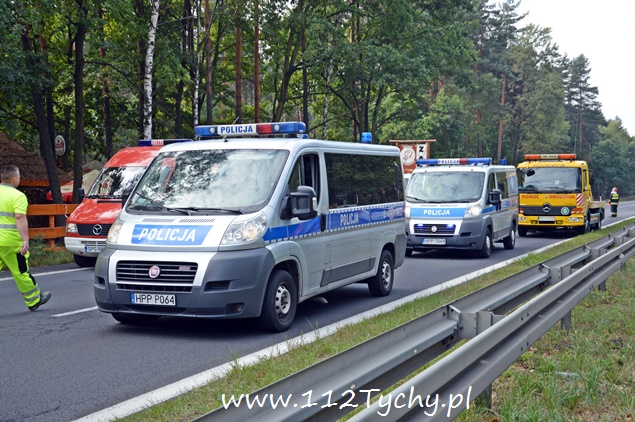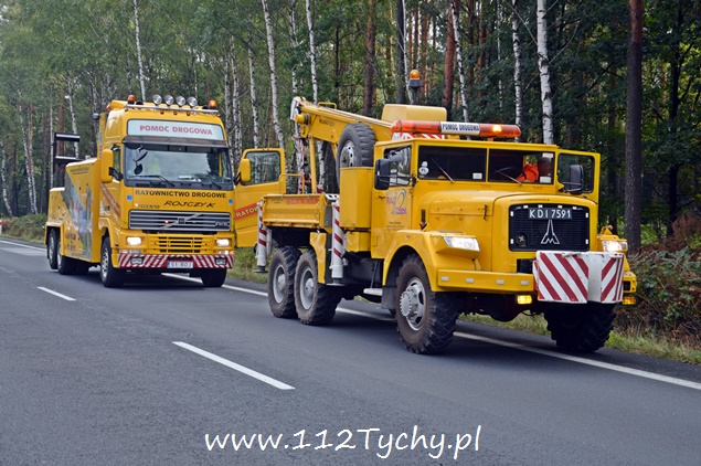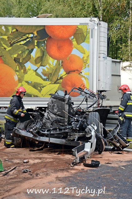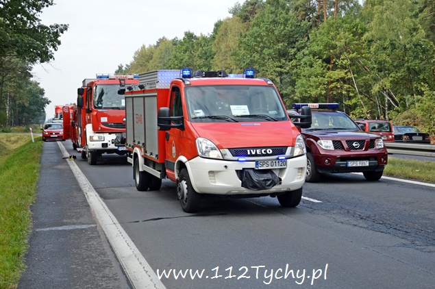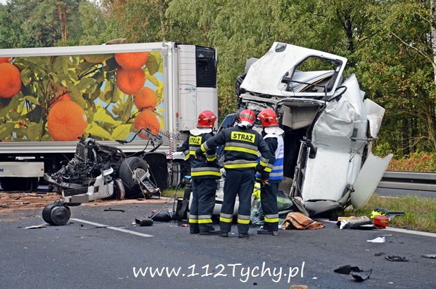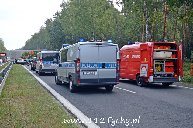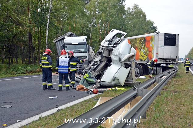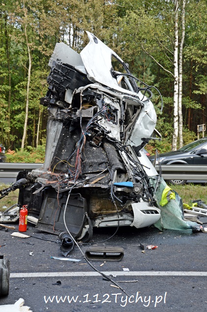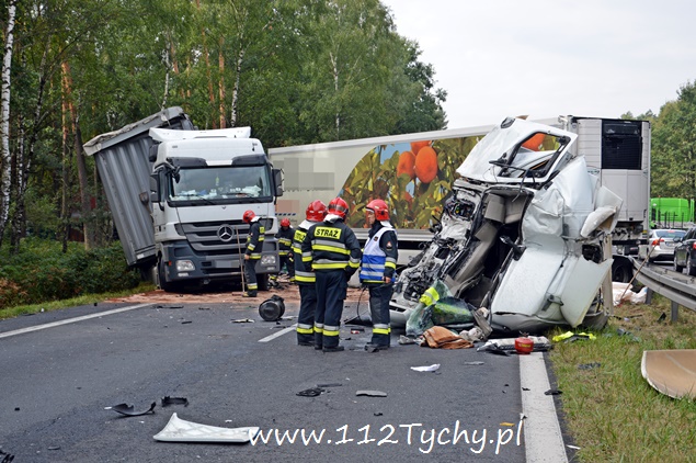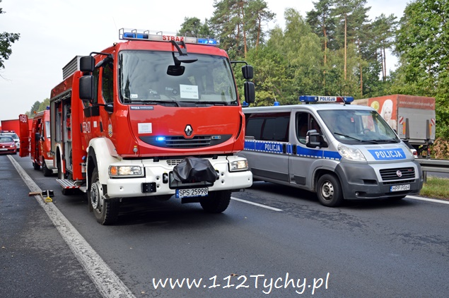 11 września około godziny 9 na DK 1 w Kobiórze, w kierunku na Katowice przy zjeździe na Zameczek Promnice doszło do wypadku drogowego z udziałem dwóch samochodów ciężarowych. Na tył poprzedzającego Mercedesa z naczepą z dużą siłą najechało Renault z naczepą. Siła uderzenia była tak ogromna, że kabina Renault – a została wyrwana z podwozia i odrzucona kilka metrów od niego. Na miejsce wysłane zostały zastępy z JRG Tychy (GBA, GCBA, SCRt), JRG Pszczyna (GBA, SLRt, SLRChem), zespoły ratownictwa medycznego i patrole Policji z KPP Pszczyna i KMP Tychy. Ruch w kierunku Tychów w miejscu zdarzenia został całkowicie wstrzymany. Poszkodowane zostały dwie osoby z Renault. Stan kierowcy był na tyle poważny, że została podjęta decyzja o konieczności wezwania na miejsce śmigłowca LPR – Ratownik 4. Śmigłowiec przetransportował mężczyznę do szpitala w Sosnowcu. Pasażerka natomiast została zabrana do szpitala w Tychach. Na czas lądowania i startu śmigłowca ruch na DK 1 został całkowicie wstrzymany. Na miejsce przyjechał również zastęp z KW PSP Katowice (SLRr). Po dolocie śmigłowca ruch w kierunku Pszczyny został przywrócony. Policja wyznaczyła objazdy – starą drogą przez Kobiór. Trwa wyjaśnianie przyczyn i okoliczności tego zdarzenia. Usuwanie jego skutków potrwa kilka godzin. Na miejscu pracują holowniki pomocy drogowej.