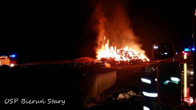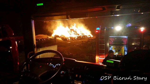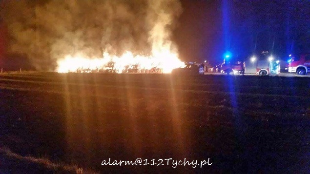 12 września około godziny 22.50 do MSK w Tychach wpłynęło zgłoszenie o łunie ognia widocznej w okolicy ul. Łanowej w Lędzinach. Na miejsce wysłane zostały zastępy z OSP Lędziny (GCBA) i JRG Tychy (GBA, GCBA). Po dotarciu na miejsce i rozpoznaniu sytuacji okazało się, że pożarem objęte jest ponad 300 balotów słomy składowanych na jednym z pól. KDR podjął natychmiast decyzje o konieczności wezwania wsparcia. Na miejsce wysłane zostały kolejne zastępy z jednostek OSP powiatu bieruńsko – lędzińskiego: jeden z OSP Imielin (GBA), jeden z OSP Bieruń Stary (GCBA) i dwa z OSP Bieruń Nowy (GBARt, GCBA). W związku z podejrzeniem, że było to podpalenie na miejsce wezwany został patrol bieruńskiej Policji. Dodatkowo wezwany został także ZRM. Jeden zastęp strażaków został skierowany do obrony składowanego niedaleko kolejnego składowiska balotów. Pozostałe zastępy przystąpiły do gaszenia płonącego składowiska. Działania trwały do godzin porannych. Ostatnie zastępy wróciły do koszar około godziny 5.50. Policja prowadzi dochodzenie w tej sprawie.