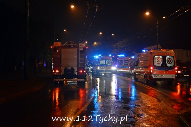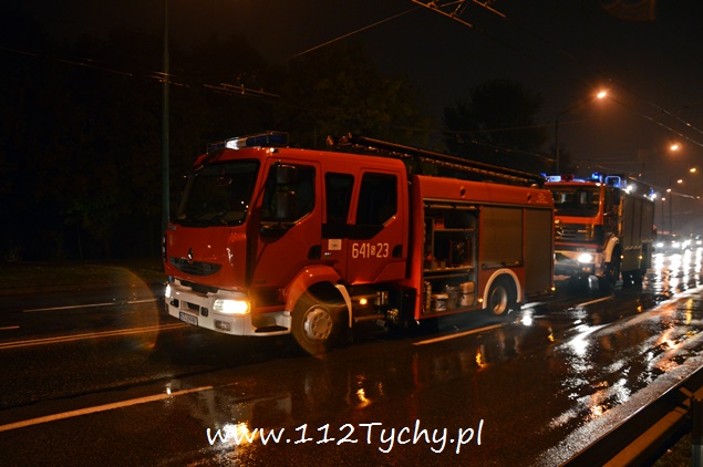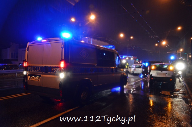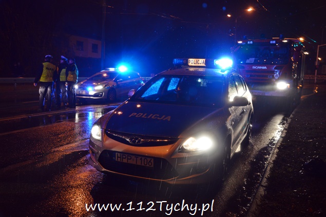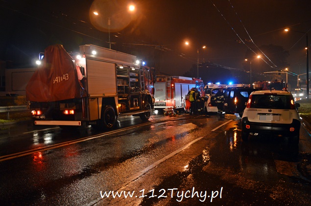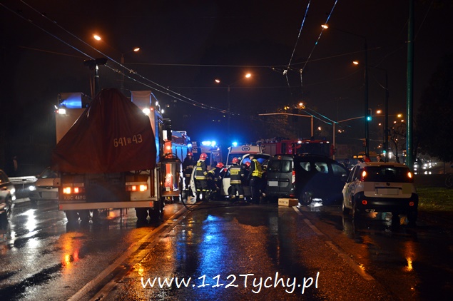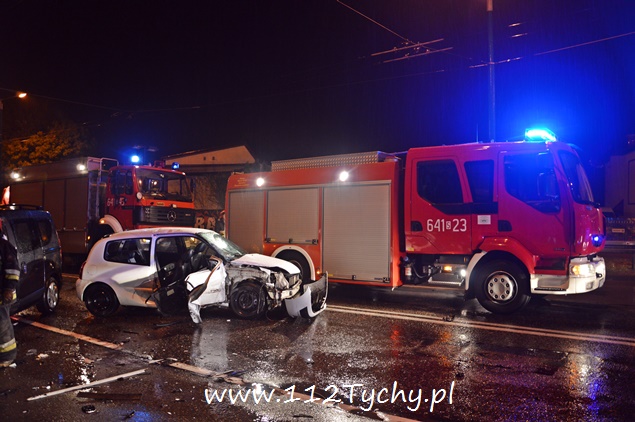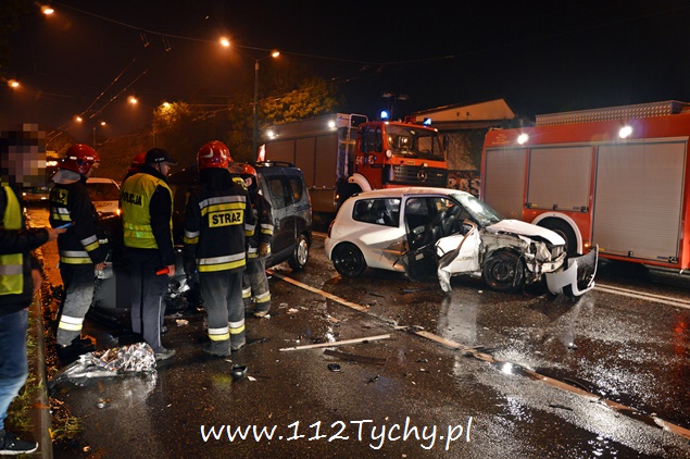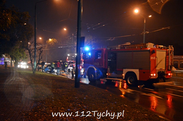15 października około godziny 21.25 na alei Piłsudskiego na wysokości skrzyżowania z ulicą Paprocańską doszło do czołowo – bocznego zderzenia dwóch samochodów osobowych. O zdarzeniu powiadomione zostały wszystkie służby. Na miejsce wysłane zostały trzy zastępy z JRG Tychy (GBA, GCBA, SCRt), dwa ZRM i patrole Policji. Po dotarciu na miejsce i rozpoznaniu okazało się, że doszło do zderzenia Dacii i Renault. Samochodem Renault podróżowały trzy osoby (mężczyzna – kierowca i dwie pasażerki), a Dacią jechał sam kierujący. Ze względu na ilość osób poszkodowany na miejsce wezwana została trzecia karetka. Cała czwórka trafiła do szpitala na dokładniejsze badania. Ruch na alei Piłsudskiego w kierunku centrum miasta został całkowicie wstrzymany, a Policja wyznaczyła objazdy. Z ustaleń pracujących na miejscu policjantów wynika, że kierujący samochodem Renault jadąc od ulicy Armii Krajowej w kierunku TESCO nie zapanował nad swoim pojazdem, wpadł w poślizg i doprowadził do zderzenia z prawidłowo jadącym kierowcą Dacii. Działania strażaków na miejscu polegały na zabezpieczeniu miejsca zdarzenia, uwolnieniu osób poszkodowanych z samochodu Renault, przekazaniu ich ratownikom pogotowia, oświetleniu terenu działań, a następnie odłączeniu akumulatorów w rozbitych pojazdach. Na miejsce wezwany został policyjny technik. Dopiero po zakończeniu przez niego czynności pojazdy zostały usunięte z drogi, a ruch w pełni przywrócony. Wstepnie zdarzenie zostało zakwalifikowane jako wypadek. Dalsze dochodzenie w sprawie tego zdarzenia prowadzą tyscy policjanci.