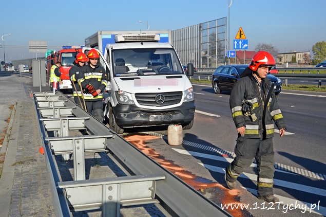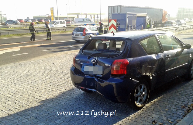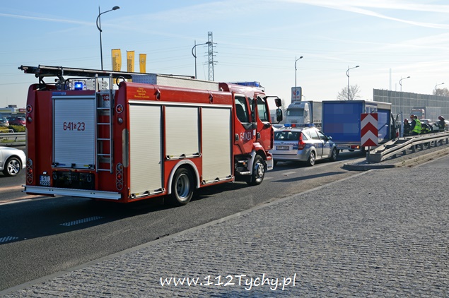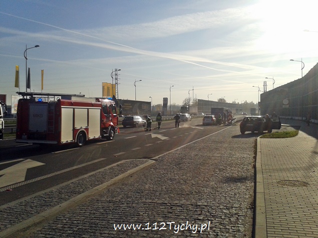 3 listopada po godzinie 12 na ulicy Beskidzkiej w ciągu DK 1 na pasie w kierunku Pszczyny na wysokości zjazdu na cmentarz komunalny doszło do zdarzenia drogowego. Kierujący samochodem osobowym Toyota przy zmianie pasa ruchu uderzył bokiem w samochód ciężarowy. Osobówka wpadła w poślizg i siłą rozpędu wjechała na chodnik i uderzyła w wiatę przystankową. Na szczęście nikogo na niej nie było. Na miejsce wezwany został patrol WRD KMP Tychy. W trakcie gdy przybyli Policjanci wykonywali swoje czynności na prawym pasie doszło do kolejnej kolizji – kierowcy zagapili się na wcześniejsze zdarzenie. Na tył zwalniającego osobowego Fiata najechał dostawczy Mercedes. Z Mercedesa zaczął wypływać olej ( doszło do uszkodzenia chłodnicy oleju). Na miejsce wezwany został zastęp straży pożarnej z JRG Tychy (GBA). Strażacy zneutralizowali wyciek i zabezpieczyli miejsce zdarzenia. Przez około czterdzieści minut ruch na tym odcinku „jedynki” był utrudniony. Nikomu z uczestników nic się nie stało. Skończyło się na uszkodzonej wiacie przystankowej (została zabezpieczona przez pracowników MZK), rozbitych samochodach i mandatach dla sprawców kolizji.