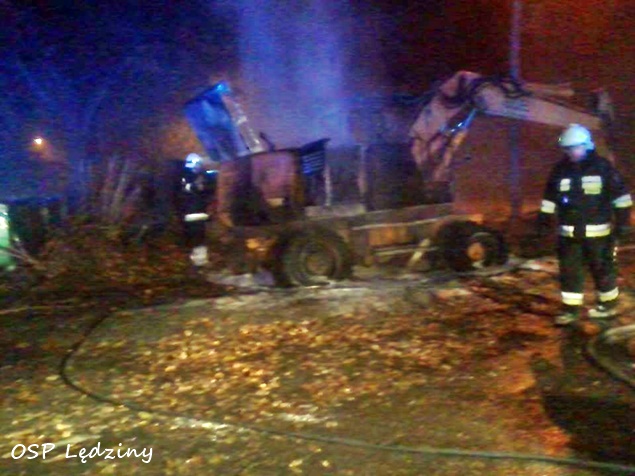 8 listopada około godziny 2.20 do MSK w Tychach wpłynęło zgłoszenie o pożarze koparki kołowej zaparkowanej przy ulicy Oficerskiej w Lędzinach. Na miejsce natychmiast wysłane zostały zastępy: OSP Lędziny (GBA) i JRG Tychy (GBA, GCBA). Po dotarciu na miejsce strażacy zastali maszynę budowlaną całą objętą ogniem. Podane zostały prądy wody i piany na palącą się maszynę. Na miejsce wezwany został również patrol bieruńskiej Policji. Około godziny 3.40 działania zostały zakończone i zastępy wróciły do koszar. Prawdopodobną przyczyną pożaru było podpalenie. Trwa policyjne dochodzenie w tej sprawie.