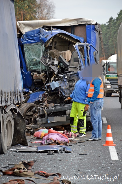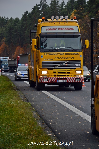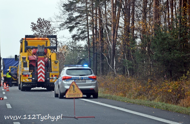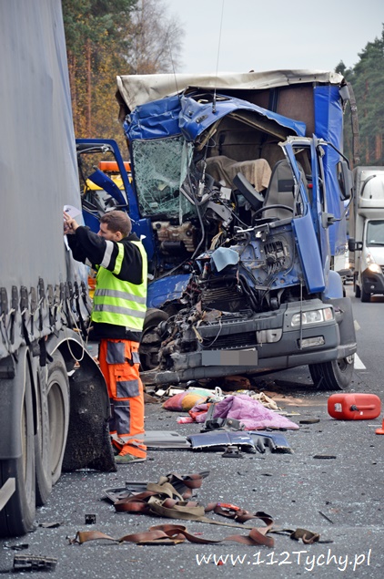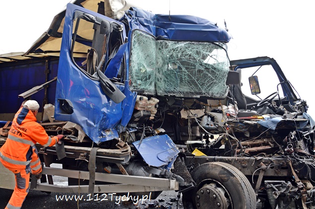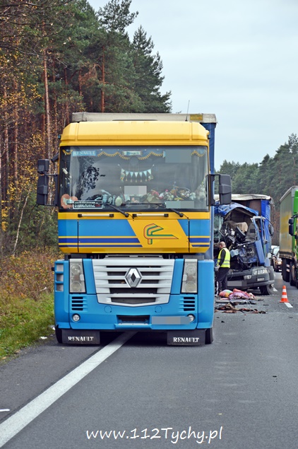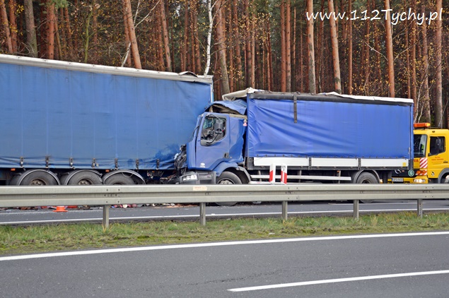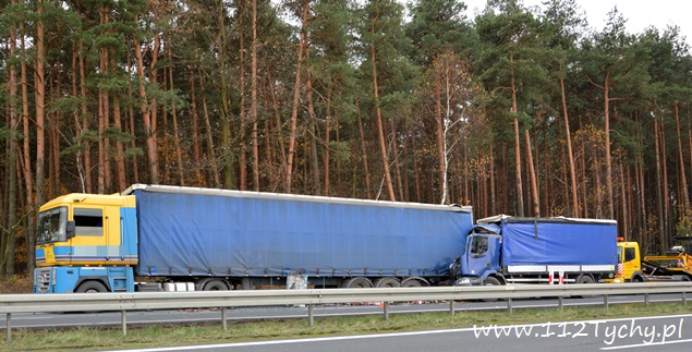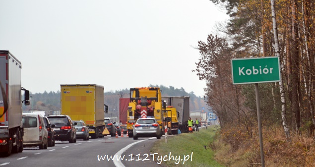 12 listopada około godziny 11 na trasie DK 1 w Kobiórze kierunek Tychy, na wysokości stacji paliw BP doszło do zderzenia dwóch samochodów ciężarowych. Na tył stojącego na poboczu samochodu ciężarowego Renault z naczepą najechał kierujący samochodem ciężarowym Renault. Kierujący samochodem, który uderzył w tył poprzednika został zakleszczony w kabinie. Na miejsce wezwana została straż pożarna z JRG Pszczyna (GBA, SLRt), pszczyńska drogówka, ITD i ZRM. W wypadku ucierpiał 35-letni kierowca ze Świętochłowic. Ruch w tym miejscu odbywał się lewym pasem w kierunku Katowic. Ze względu na potrzebę przeładunku towaru i konieczność odholowania pojazdów, utrudnienia w tym miejscu trwały do wieczora. Miejsce zdarzenia było zabezpieczone przez policjantów. Na miejscu pracowała pomoc drogowa, której pracownicy przeładowali ładunek. Zalecamy był zjazd z „jedynki” w lewo na skrzyżowaniu z sygnalizacją świetlną w Kobiórze i kierowanie się na „starą” drogę do Tychów. Policjanci WRD KPP Pszczyna wyjaśniają przyczyny i okoliczności tego wypadku. Utrudnienia w ruchu trwały do godzin wieczornych. Pojazdy zostały odholowane dopiero po godzinie 20 i wówczas został przywrócony ruch na obydwóch pasach w kierunku Tychów.